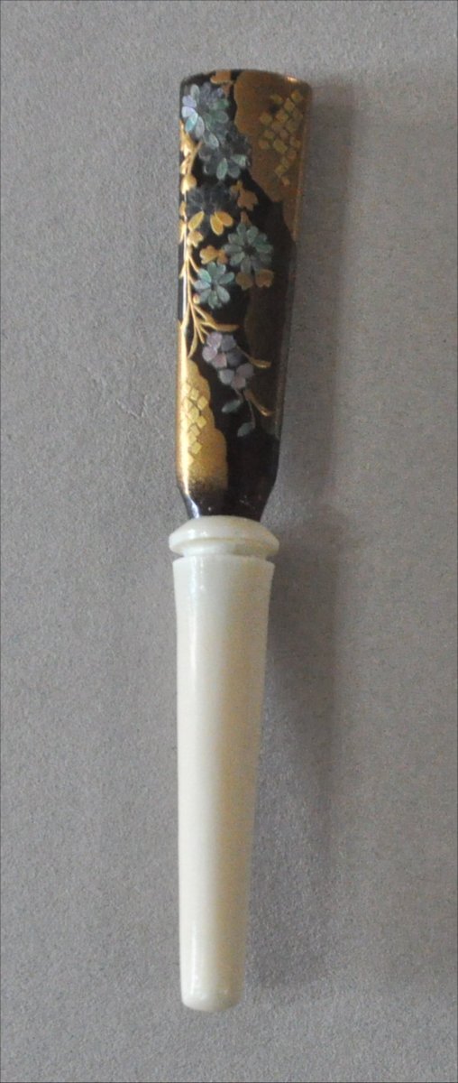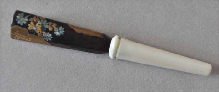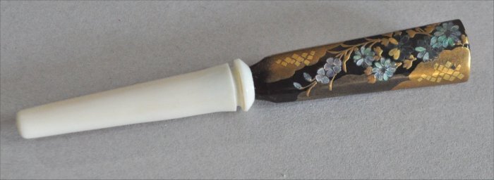 ナンタケットバスケット用のべっ甲とマンモス牙に張り合わせの金蒔絵と螺鈿の花デザインペグ