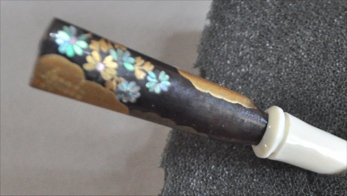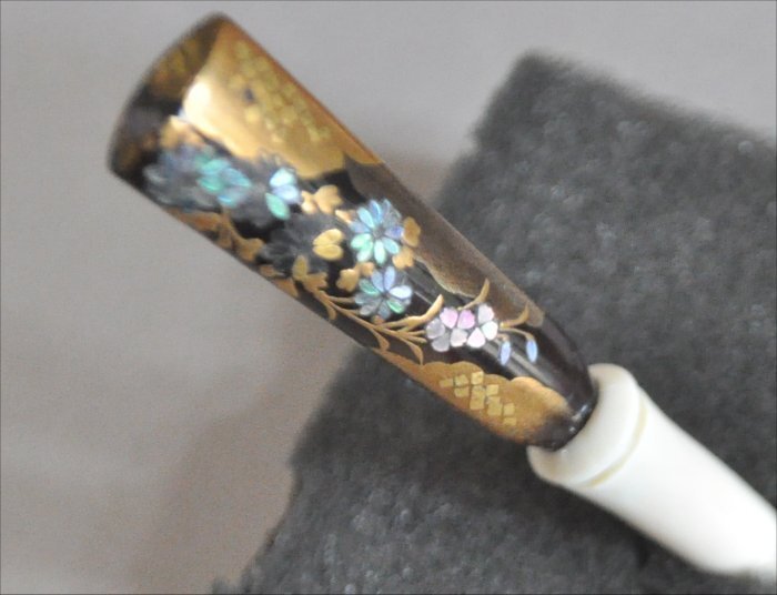 べっ甲とマンモス牙に張り合わせの金蒔絵と螺鈿の花デザインペグ