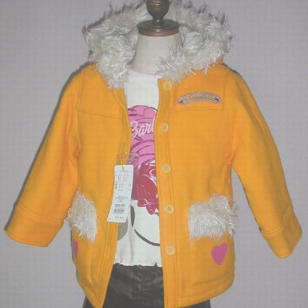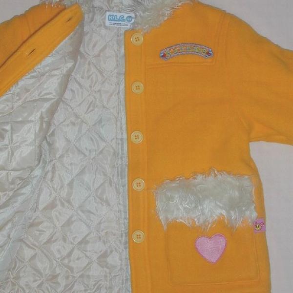 KLCの明るいみかん色の、フリース中綿入りコートで、フードは風の入らない縫い付けです。
