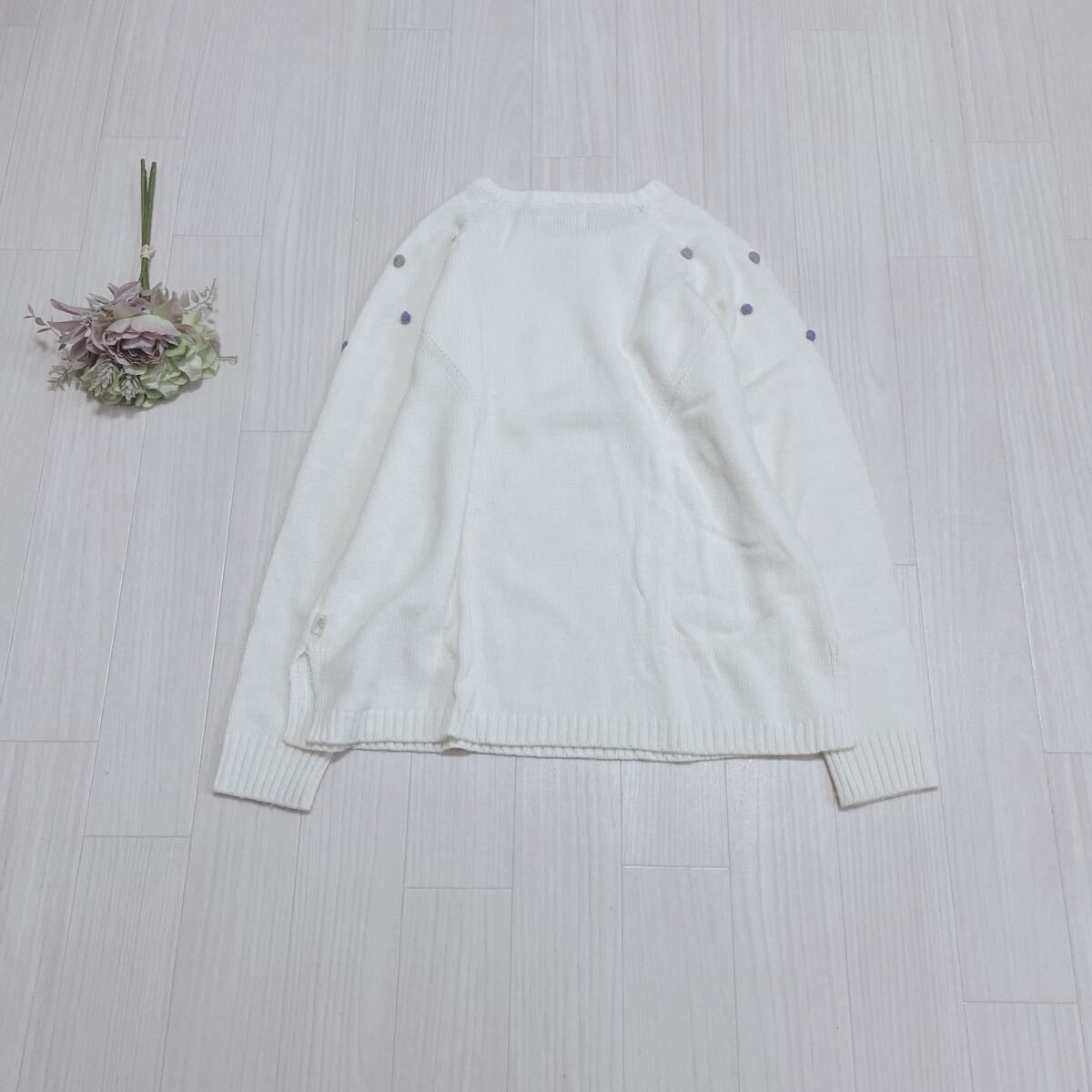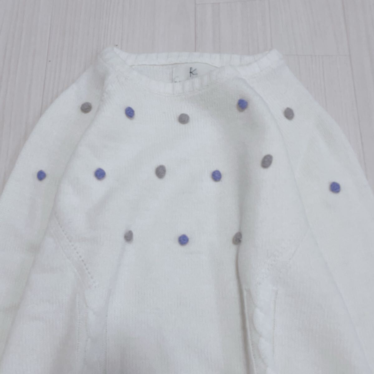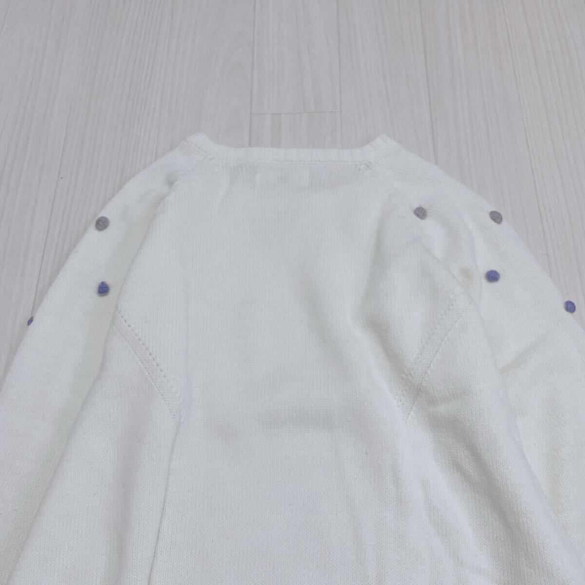 ホワイトのベースに、グレーとパープルの優しい色合いのポンポンがアクセントになった上品なデザインです。フロントと袖にケーブル編みを施し、立体感のある表情に仕上げています。胸元にはブランドのワンポイント刺繍ロゴが入っており、さりげないポイントになっています。