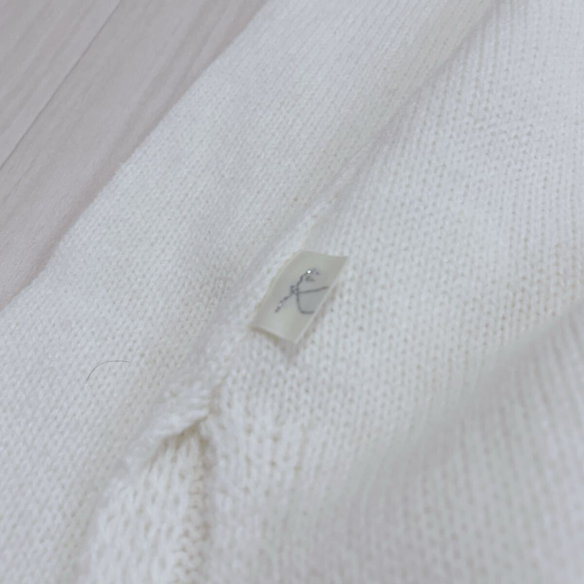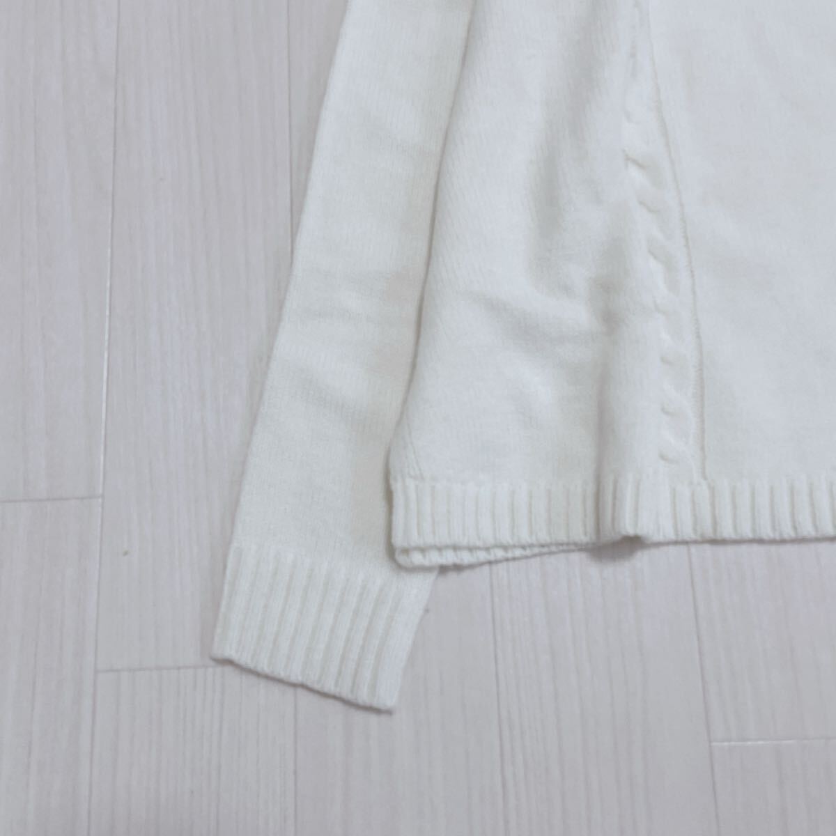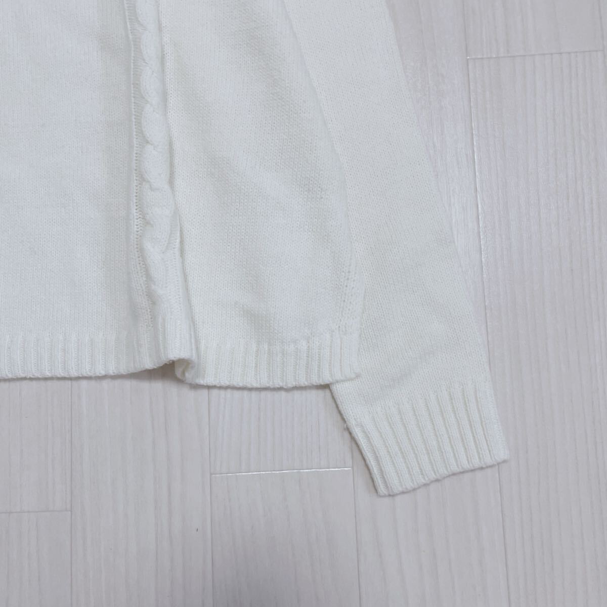 ホワイトのベースに、グレーとパープルの優しい色合いのポンポンがアクセントになった上品なデザインです。フロントと袖にケーブル編みを施し、立体感のある表情に仕上げています。胸元にはブランドのワンポイント刺繍ロゴが入っており、さりげないポイントになっています。