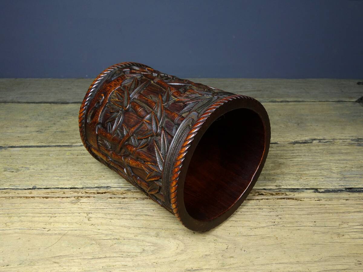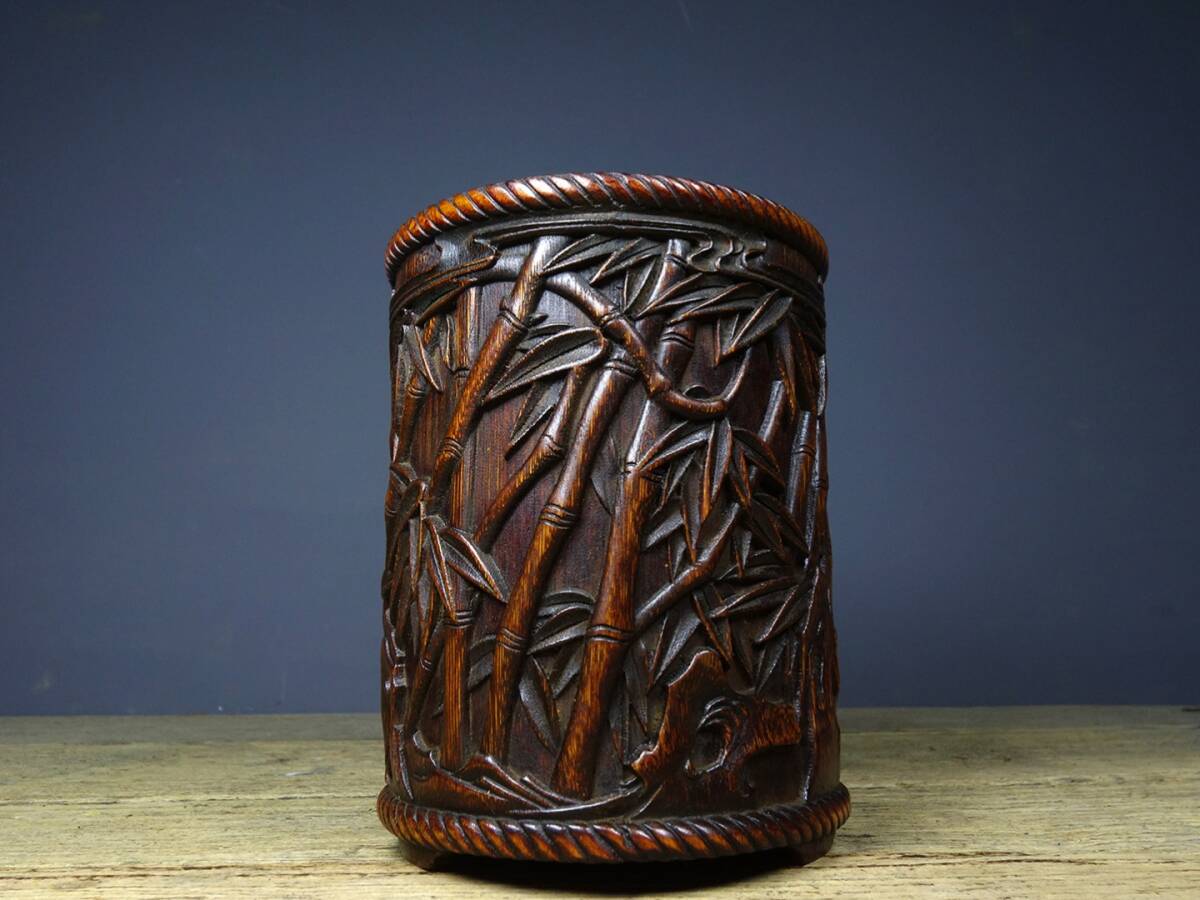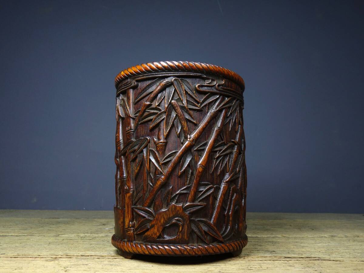 【超珍館蔵】竹材 細密彫 節節高升紋 筆筒 筆立 文房具 書道品 置物 賞物 古賞物 古董品 古美術品 時代物 旧家蔵出 稀少珍蔵品
