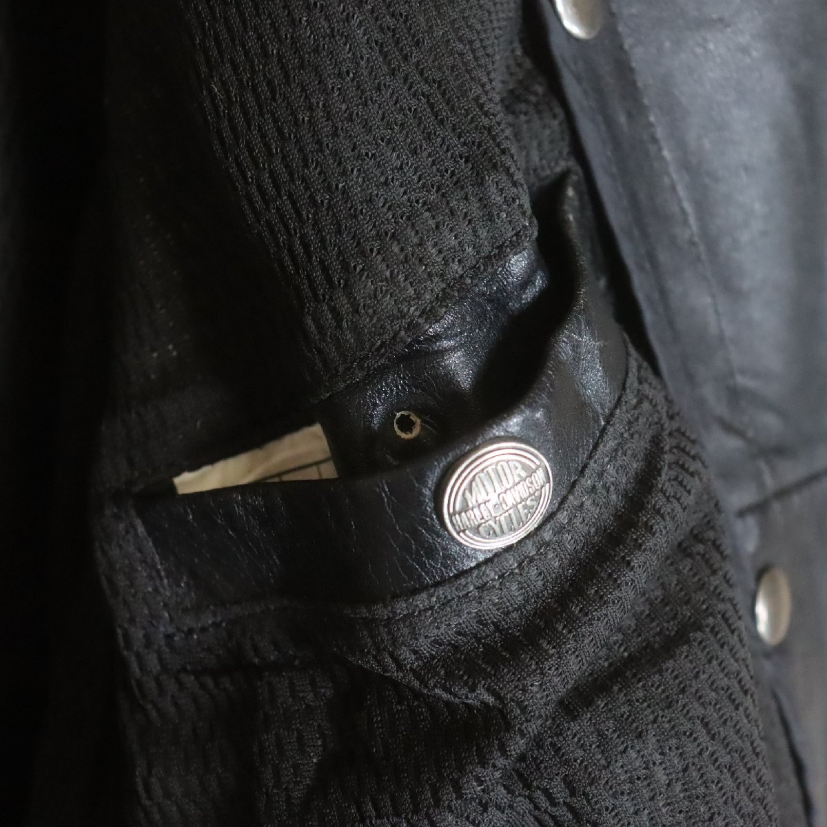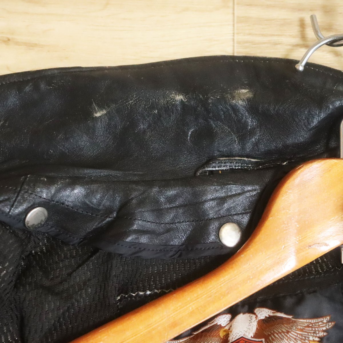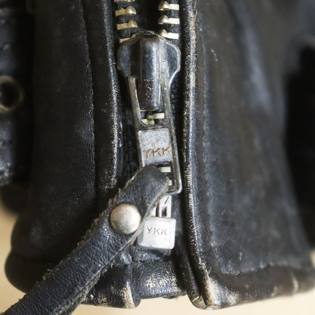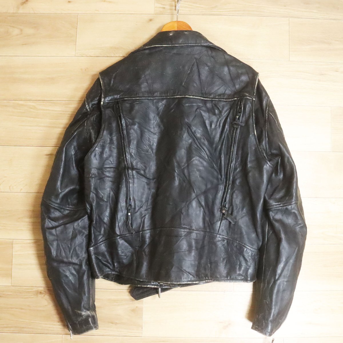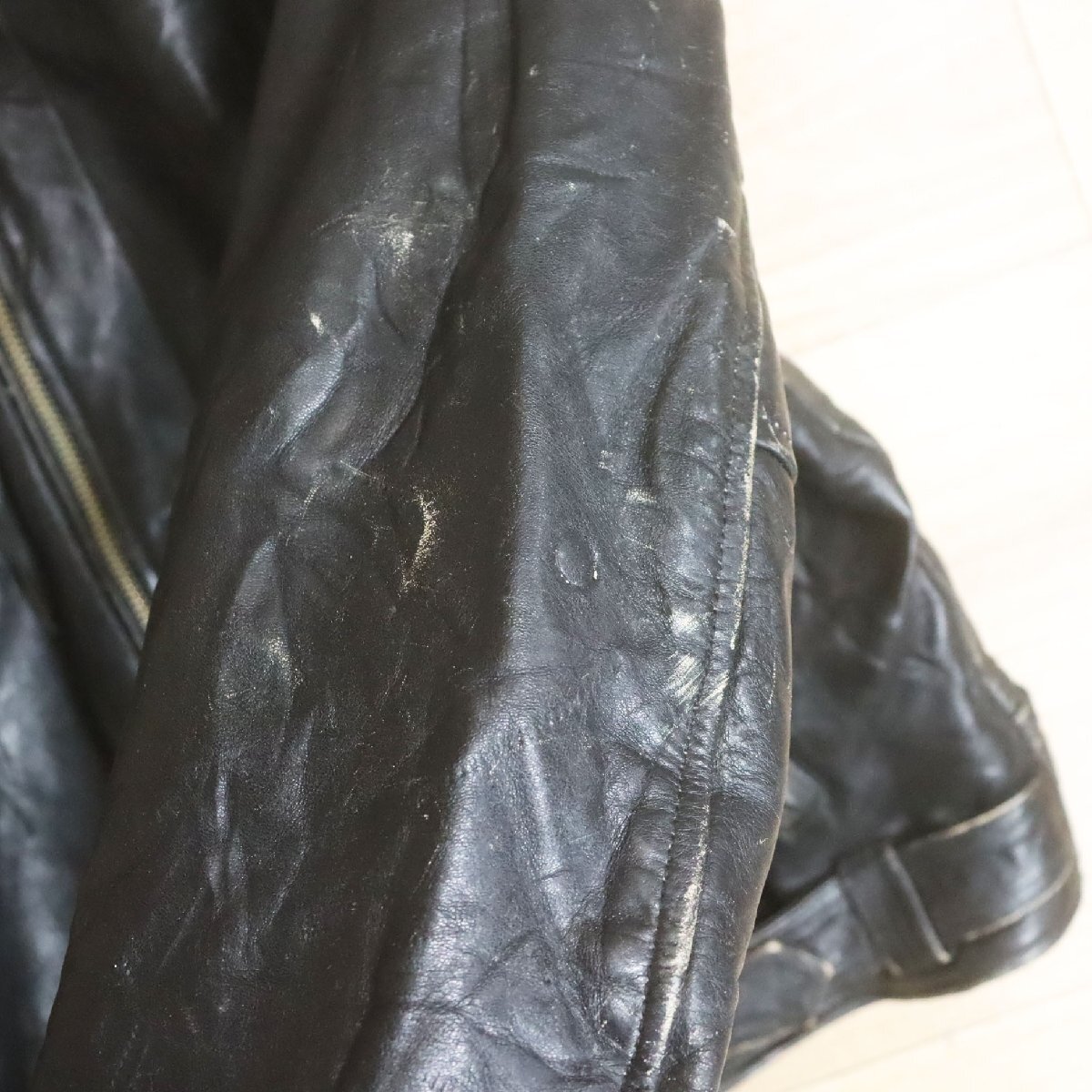 中古品です。使用感があります。背中ジッパーのスライダー引き手交換、左胸ジッパーの上部スライダーパーツ破損、内ポケットの凸側ボタン欠損、レザーに経年による擦り傷があります。ライナーは付属しません。