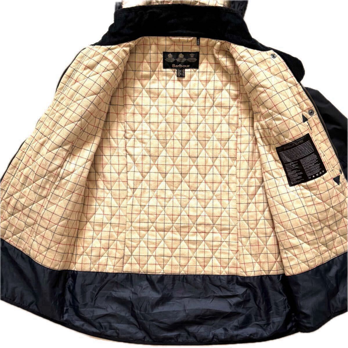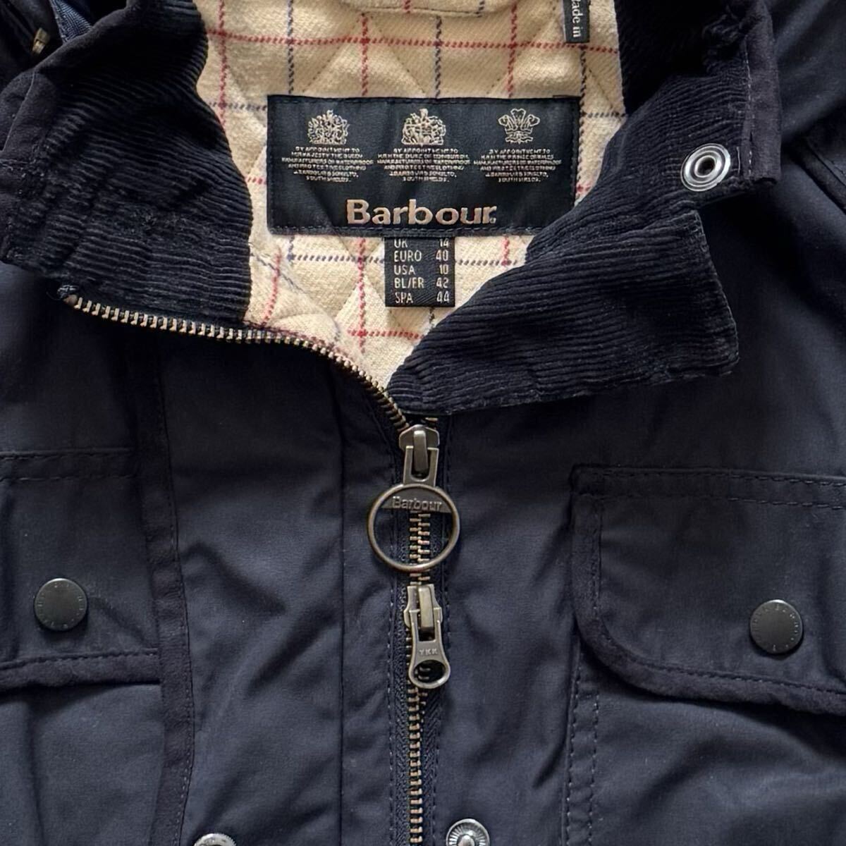 裏地が薄中綿入りのキルティング仕様になっており、オイルジャケットにありがちな冷んやり感はなく暖かいです。表地はショルダーやサイドはキルティング仕様、アームにはスウェード調のパッチ付きです。フードは取り外しが可能です。