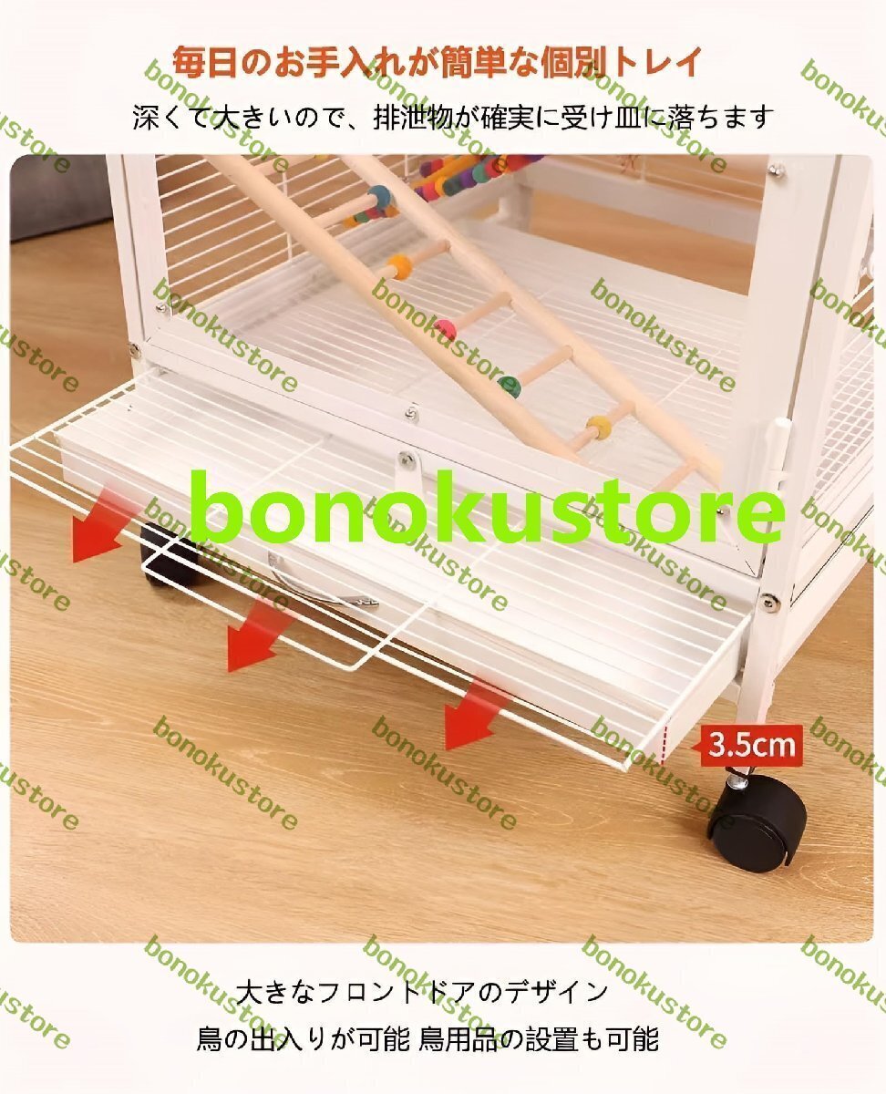 【掃除が簡単】底部には引き出し式トレイが付いており、糞、羽、食べかすなどの掃除が簡単に行えます。