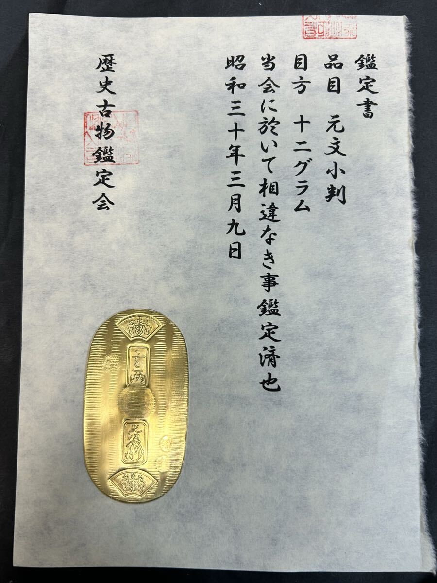 (鑑定書)元文小判 重さ約12g コレクション 古銭 アンティーク 大判 小判 貨幣