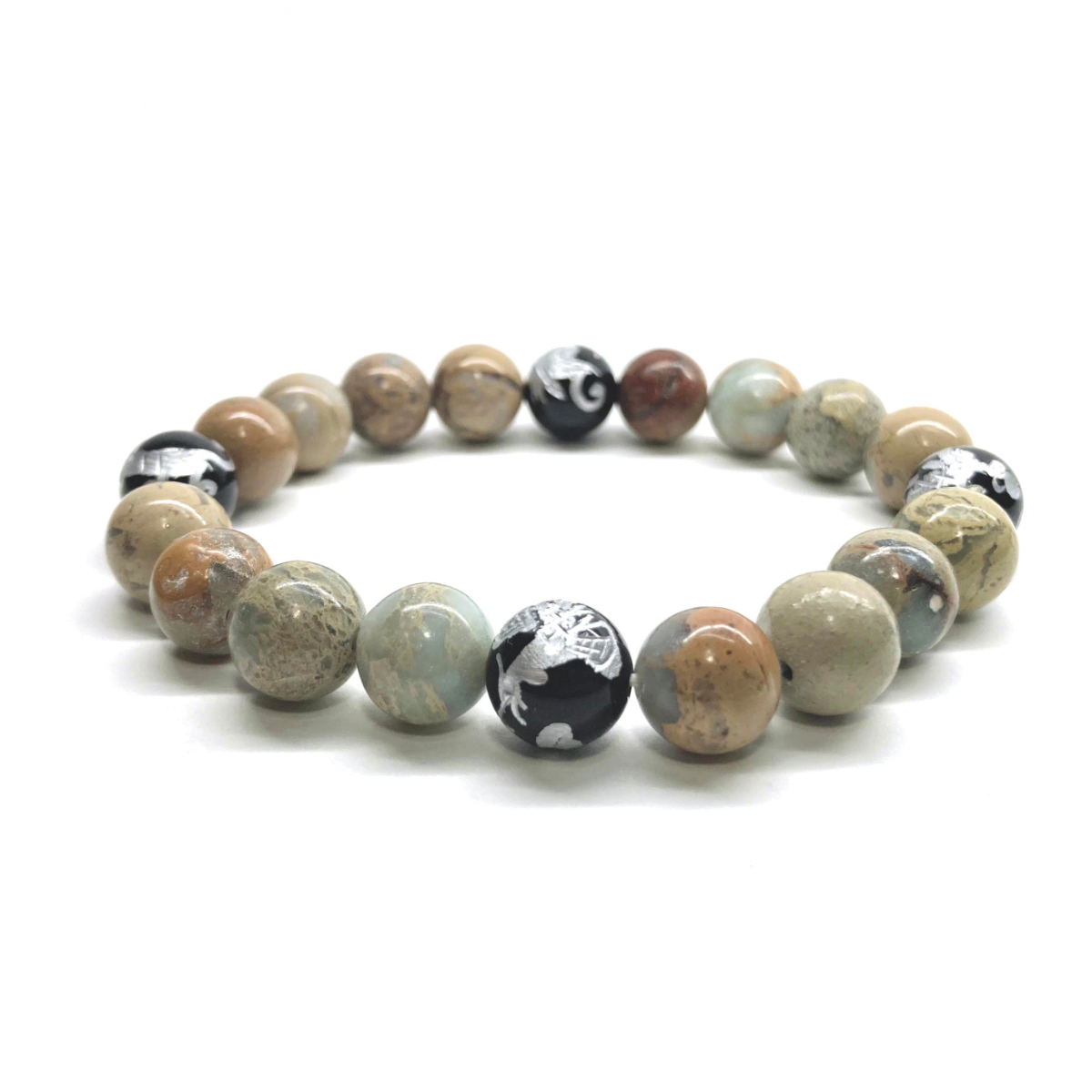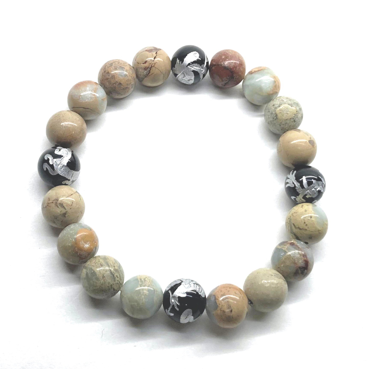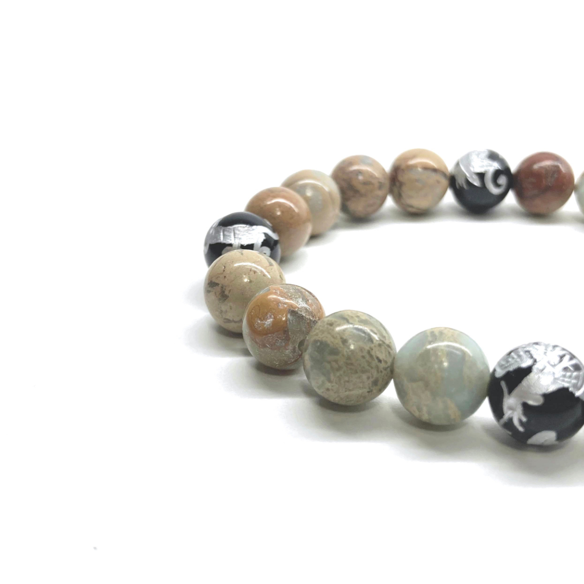 10mm 四神獣銀彫オニキス×インプレッションストーン パワーストーン ブレスレット天然石 運気上昇 開運 金運 青龍 白虎 玄武 朱雀 ☆