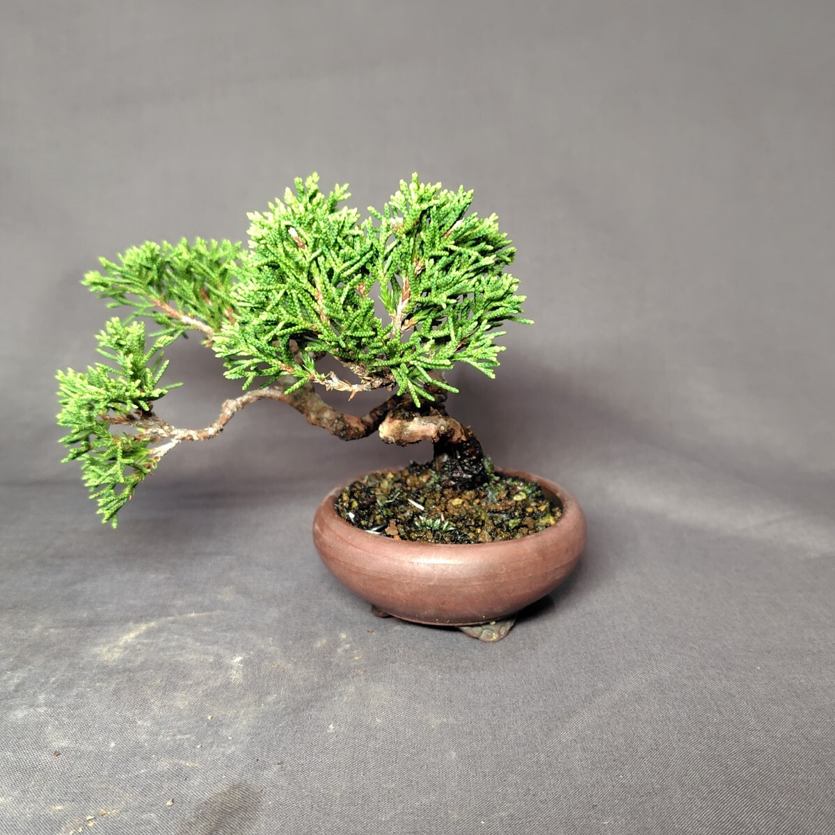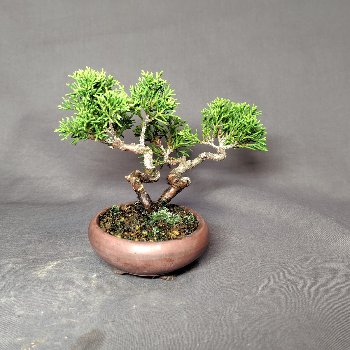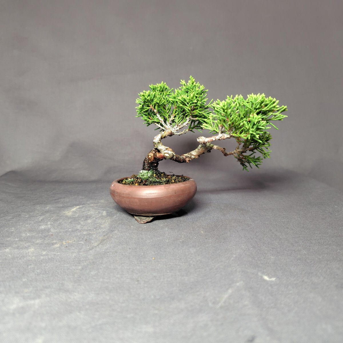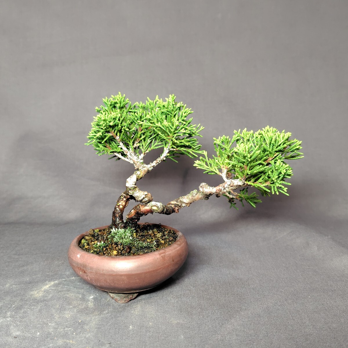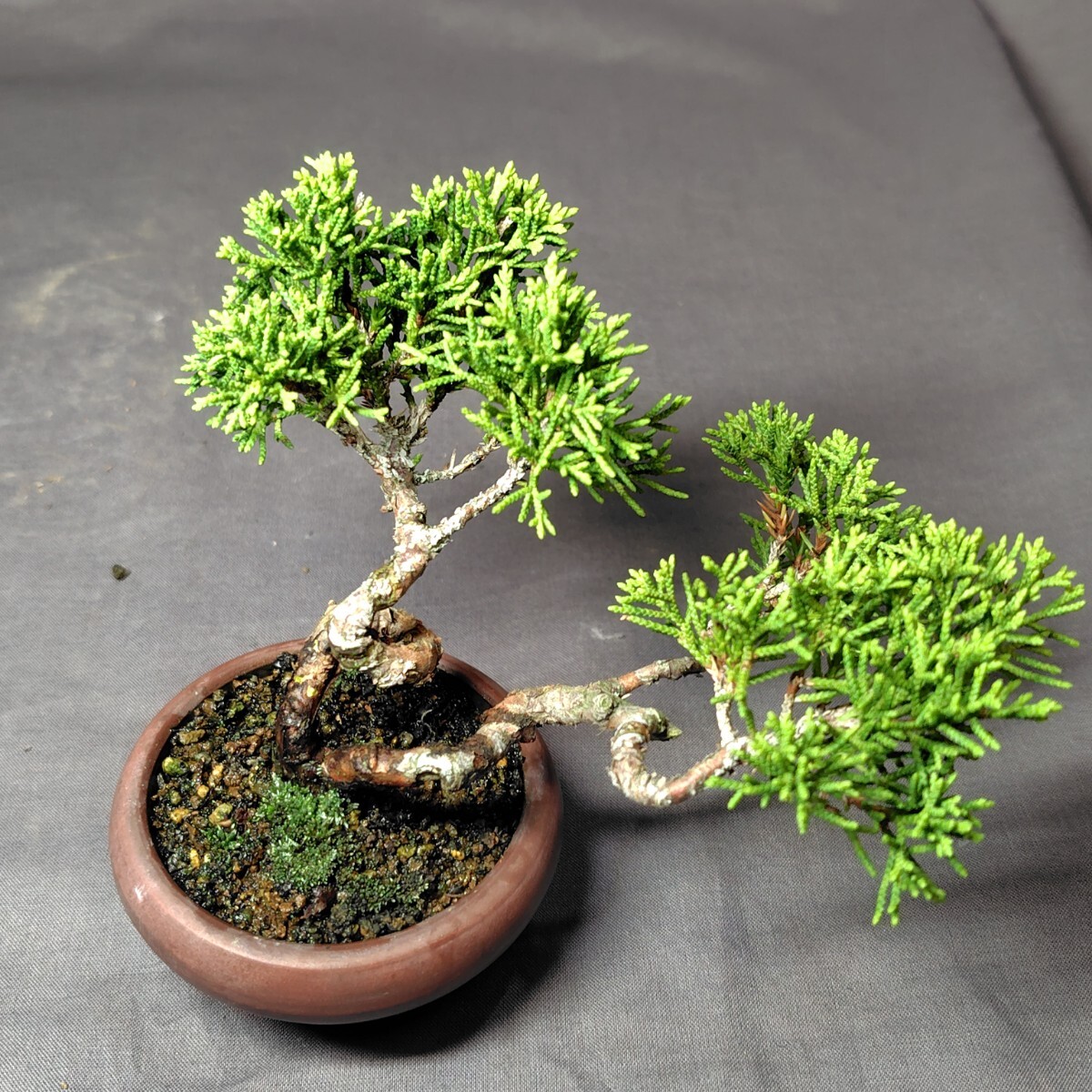 双幹のミニ真柏盆栽です小鉢に納まって2年半です。