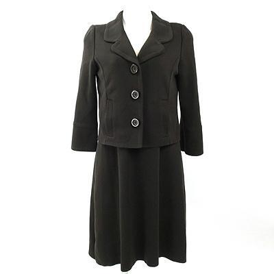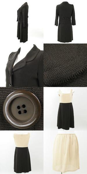 フォーマル対応のジャケットとワンピースのセットアップ☆ 洗練されたネックラインが目を惹くバイカラーのシンプルワンピース。 ジャケットは丸みのあるお衿や大ぶりな釦がアクセントになり、 長めのお袖とすっきり丈の身頃でバランスよく仕立てられております。 しっかりとした編み感で、さらっとしたコットンアクリルニット♪ ペチコートが付属しております。 ジャケット着丈約48cm 袖丈約48.5cm 肩幅約37cm バスト約88cm ワンピース着丈約92cm 肩幅約38.5cm バスト約87cm 【サイズ】:(42) 【素 材】:(本体 綿 52% アクリル 48%(ペチコート ポリエステル 100%(レース ナイロン 100%))) 【 色 】:(茶) 【程 度】:(A) 17140630-001 101 037 | ||||