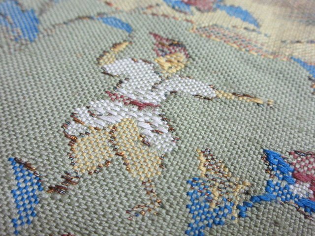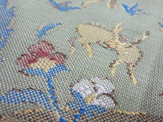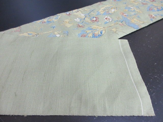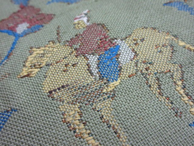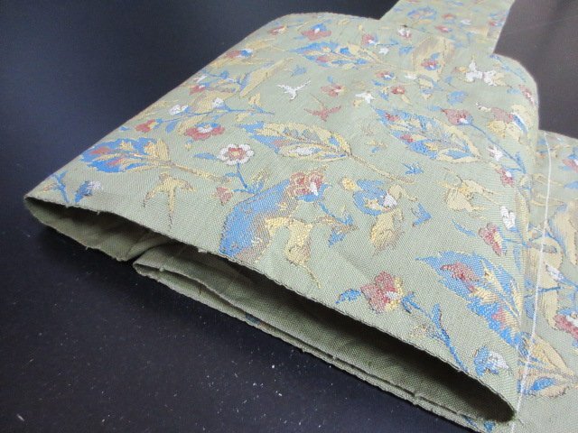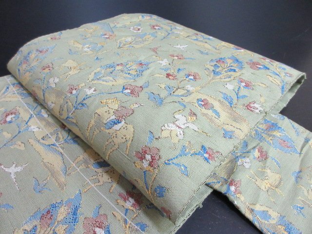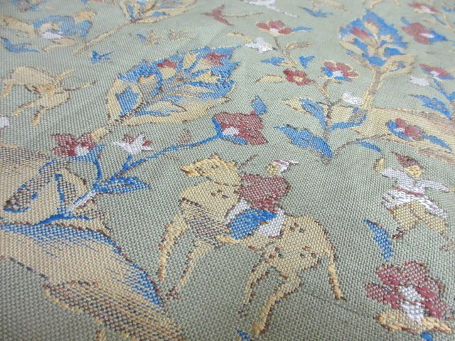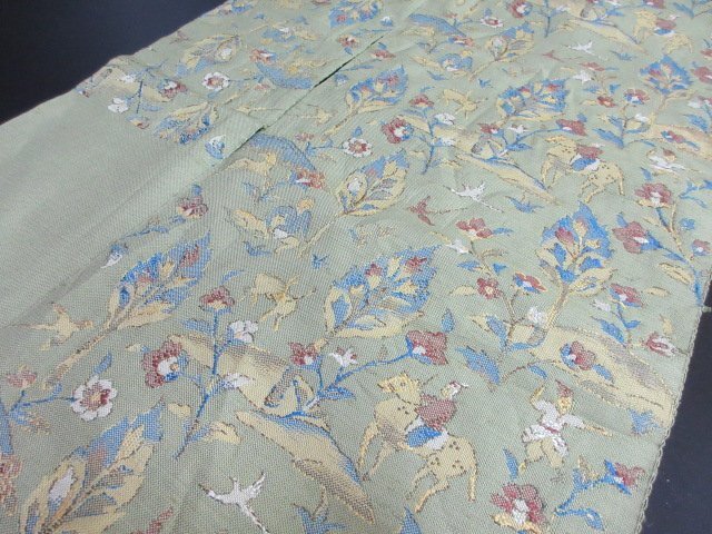 商品名 | 1円 中古 名古屋帯 薄緑色 正絹 和装 和服 人物 鹿 狩猟文 オリエンタル草花 六通柄 九寸帯 長さ348cm【夢職】★ |