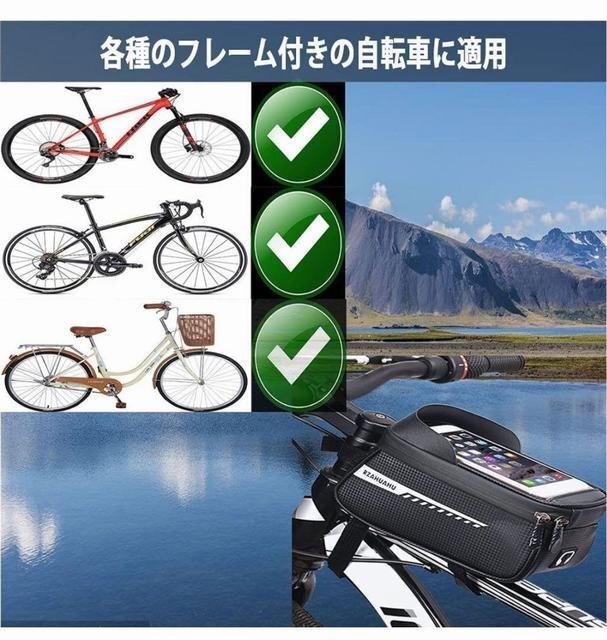 【防水、防圧、防塵】 1.防水:サイクリング中で急に雨が降っても、携帯電話にの心配はなし。 2.携帯を保護:万が一、自転車が倒したり、石、壁、地面などにぶつかったり、ロックブロストップチューブバッグはスマートフォンをちゃんと守ります。 3.防塵:長い時間ハイスビードの環境に空気の中の埃などはカメラ、ディスプレイなどに入れる可能性が高いです。このバッグに入れたら、全く問題ありません。 【大容量&収納力抜群】 自転車バッグの内部に内蔵仕切りポケットが2つありますので、カギ、イヤホン、懐中電灯、サングラス、充電用バッテリー、日焼け止めなど収納に足ります。 持ち運びがやすくて、余分な圧力を引き起こさないです。 【人間化デザイン】 スマートフォン用のポッケトの前にサンバイザーが付きますので、太陽光や夜間強光を有効に遮ることができ、メールや道路状況をいつでもチェックさせることができます。 バッグはヘッドフォンの穴がありますが、バイクでも音楽を楽しんだり電話に出たりことができます。またバッテリーで充電したまま入れておけるのでとても便利です。内蔵が一つメッシュポケットと固定バンドがあります、収納のことが簡単になります。 【取り付け簡単】 3つのマジックテープが付いていますので、バフレームバッグがしっかりと3点強力固定されます。安定性が強いし、スマホや小物を完璧に保護されます。 マジックテープの長さも調節でき、余計の長すぎる部分を自由に裁断して安心に使えます。 ロードバイク、マウンテンバイク、クロスバイク、ほとんどの種類のバイクに適用しています。通勤、通学、サイクリング 、旅行などのアウ トドア活動に適しています。 【高感度タッチスクリーン&イヤホーン差し込む穴】 タッチスクリーンは高感度のTPUタッチパネルがを採用し、透明感も優れています。 タッチフィルムが防水機能あるので雨の日利用しても安心できます。また、フレームバッグの末端にイヤホーン差し込む穴が付いていますので、サイクリング途中で電話したり、音楽を聞きたり、充電もできます。
