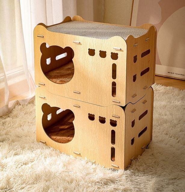 キャットハウス 猫ハウス 爪とぎ2枚付き 猫おもちゃ 木製 ストレス解消 2匹飼養 上下2段 爪研ぎ Bタイプ