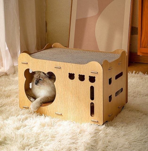 上下2段に爪研ぎがついて爪を研ぐことができます。中は広すぎずほどよく狭く、猫も居心地が良いです。中に入れるし、上に乗るのも可能で、そして好奇心いっぱいの猫ちゃんが小窓から外の様子を確認できます。