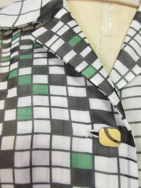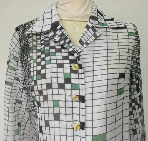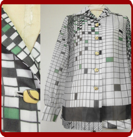 ♪古着レトロ・Vintage白緑モダンポップ柄ブラウス♪