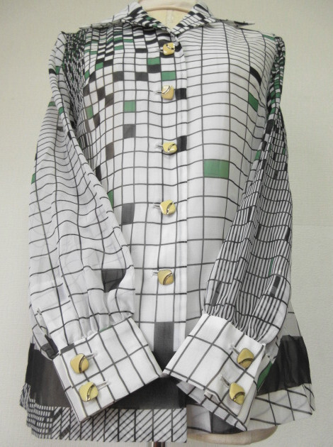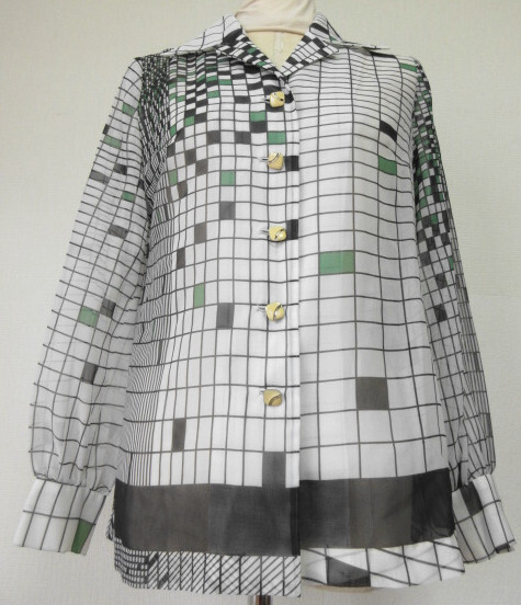 古着♪レトロ・Vintage白緑モダンポップ柄ブラウス♪モッズシャツ70s60s70年代60年代ヴィンテージ昭和モダン長袖秋冬即決まとめヨーロッパ