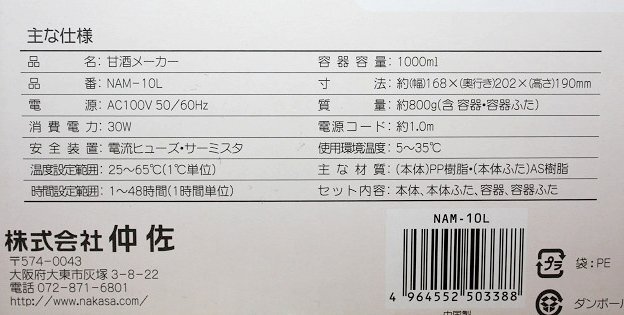 展示品 美品 仲佐 甘酒メーカー NAM-10L 甘酒のきもち 発酵食品 塩麹 西京味噌 納豆 ヨーグルト クリームチーズ NAKASA