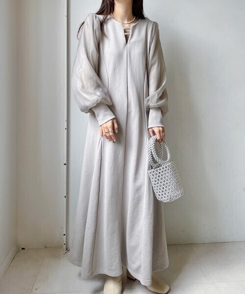 光沢のあるオーガンジーをあしらった袖が、程よいボリュームで華奢見えを叶えます。袖が二重になっている事により肌の透け感が無く、春夏のシアー感とは一味違った雰囲気をお楽しみ頂けます。フロントの丸みを帯びたキーネックと落ち感の良いフレアシルエットで、細部のデザインまで凝った1枚。