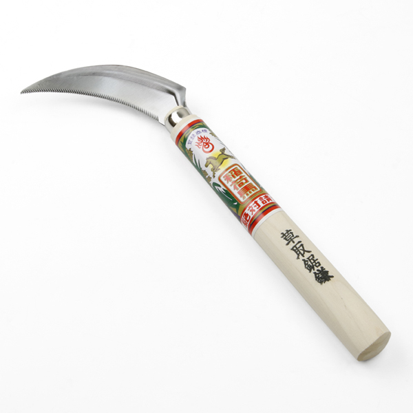この鎌の刃は通常の鋸鎌では切り難いビニール紐も簡単に切断できる特殊加工仕様。
