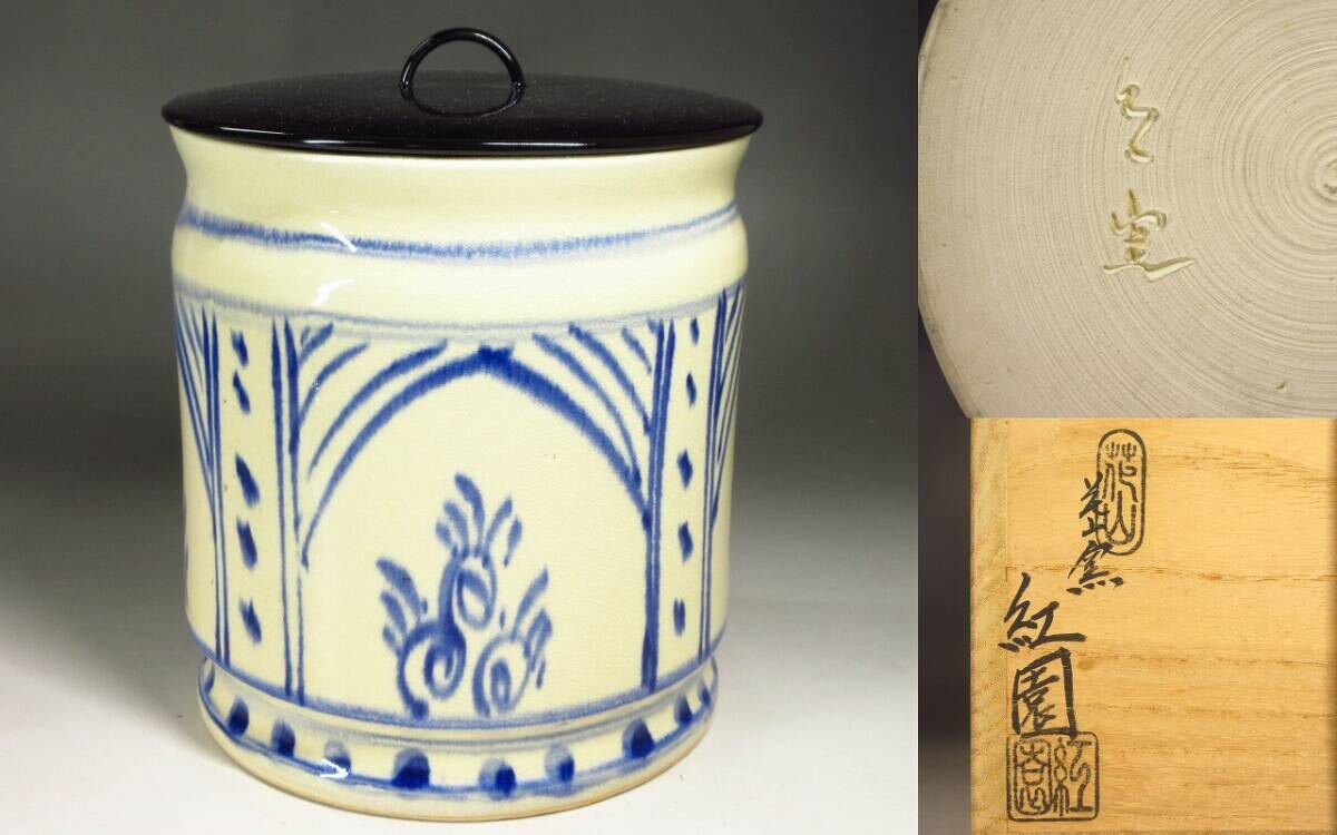 花山窯『木場紅園』造 染付水指 漆蓋 共箱 共布 茶道具 本物保証