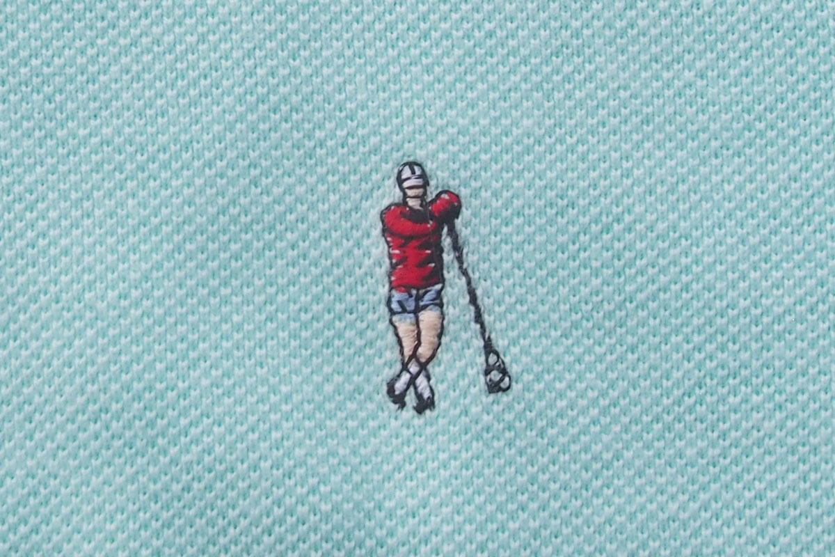 ライトブルーのボディに、胸元の刺繍ロゴがさりげないアクセントとなり、シンプルながらも品のある佇まいを演出します。