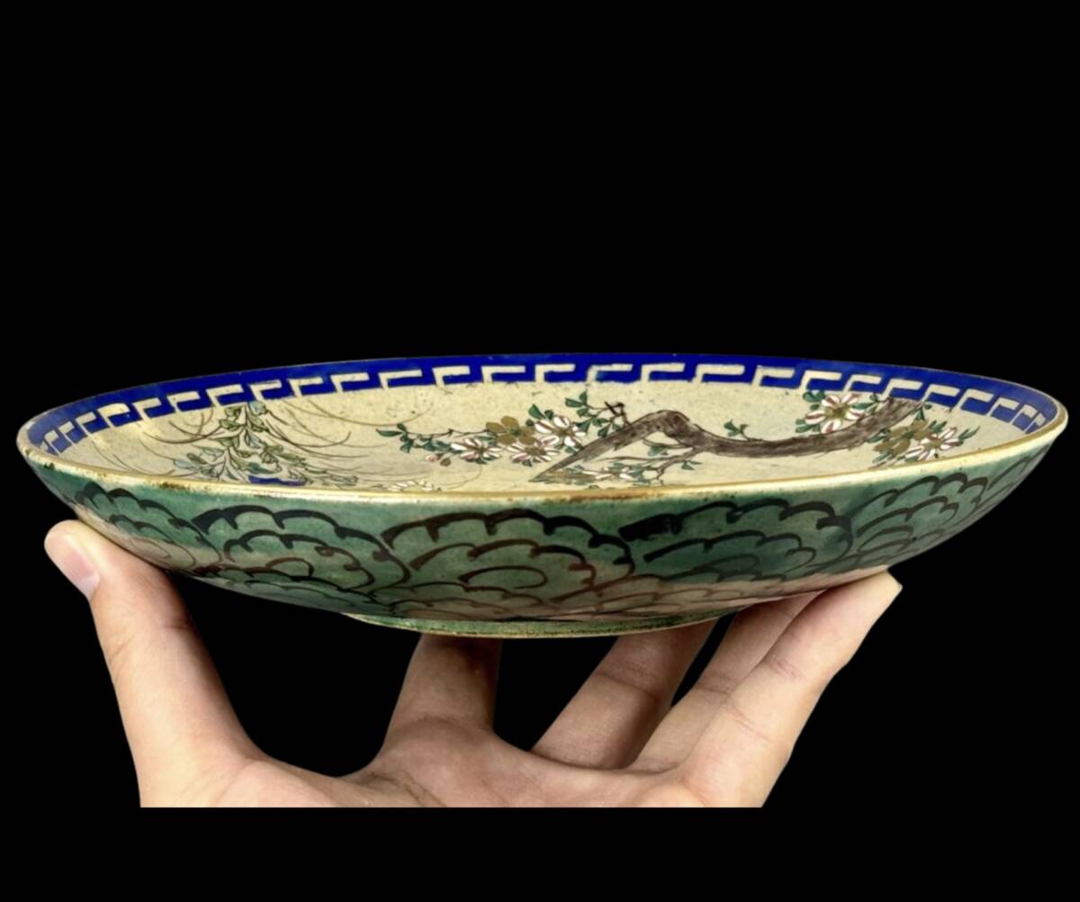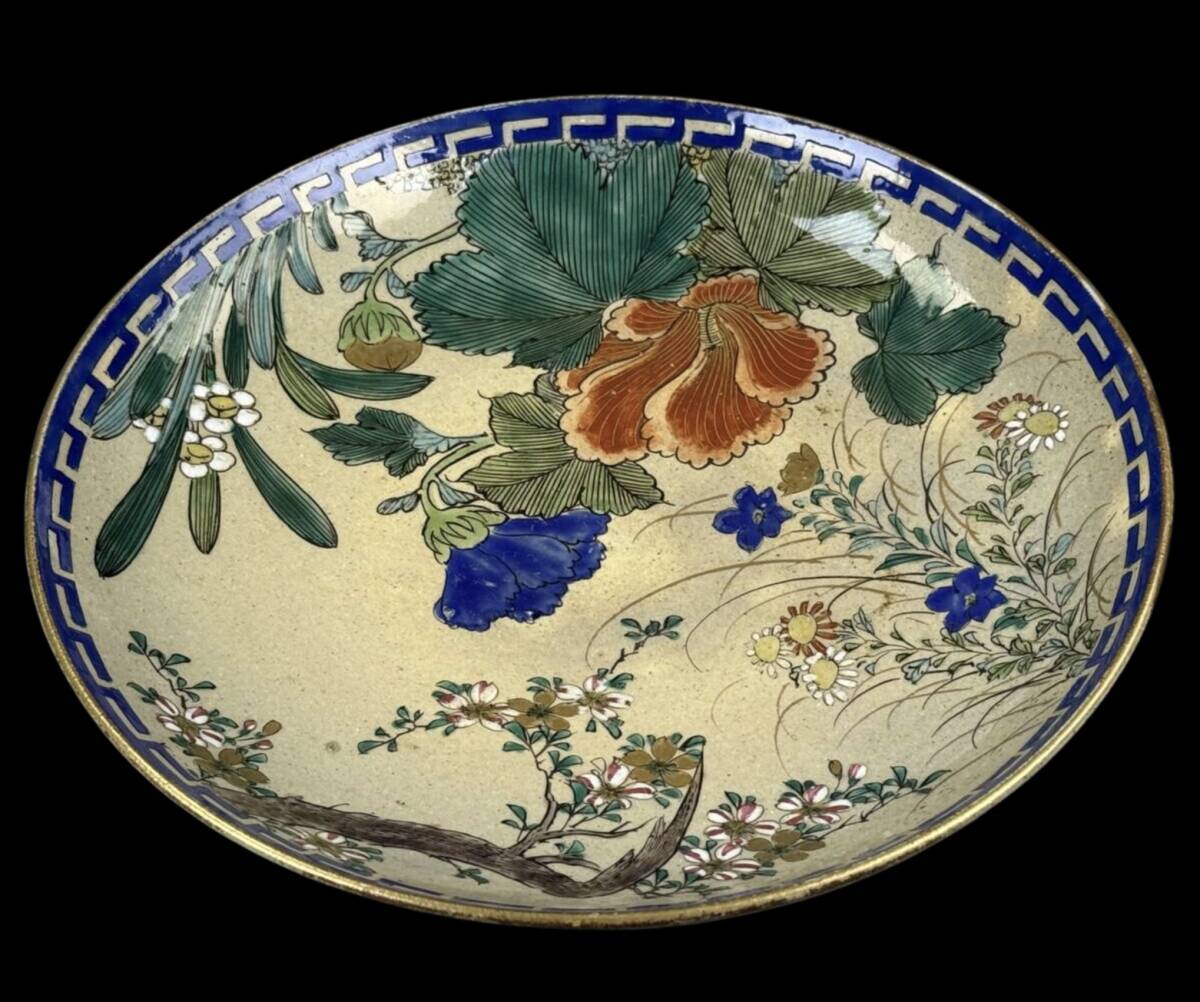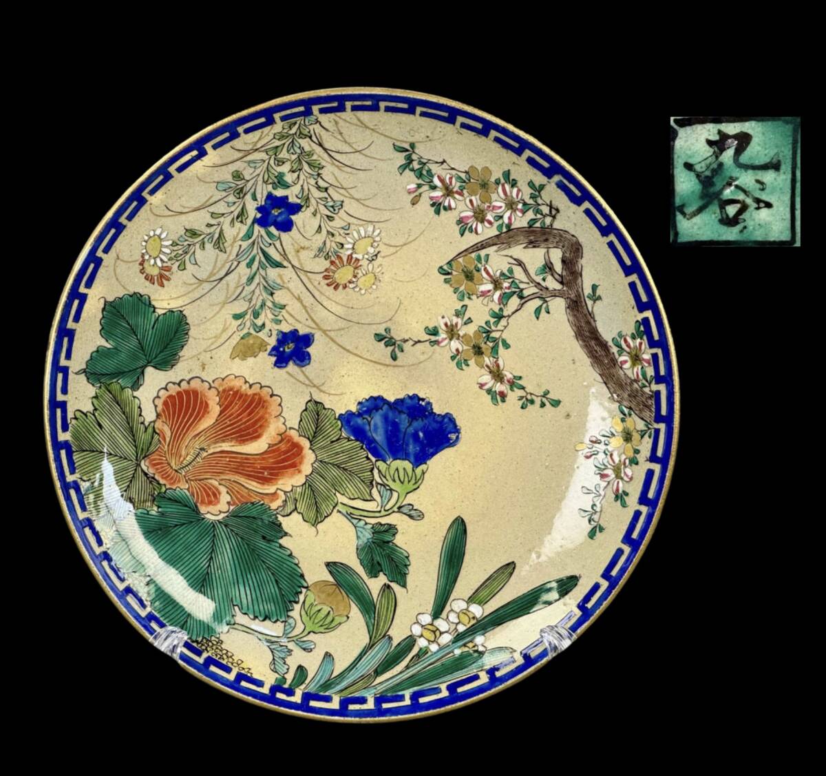 【偲】青九谷 金彩色絵 花文七寸皿 幅21.3cm 古九谷焼 飾皿 枝垂れ花と葵咲く色絵装飾 古九谷様式の華やぎと雅趣 j-199