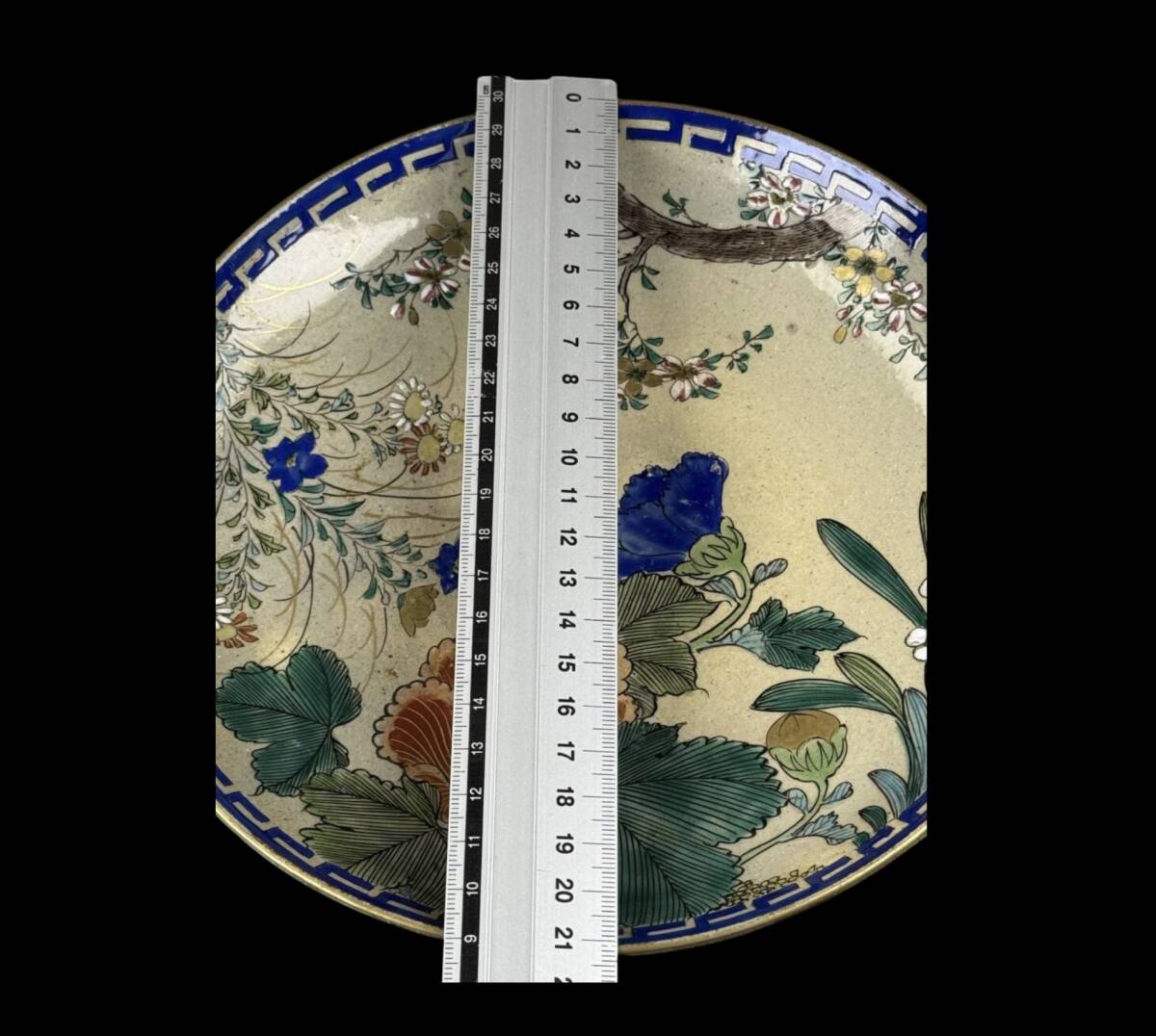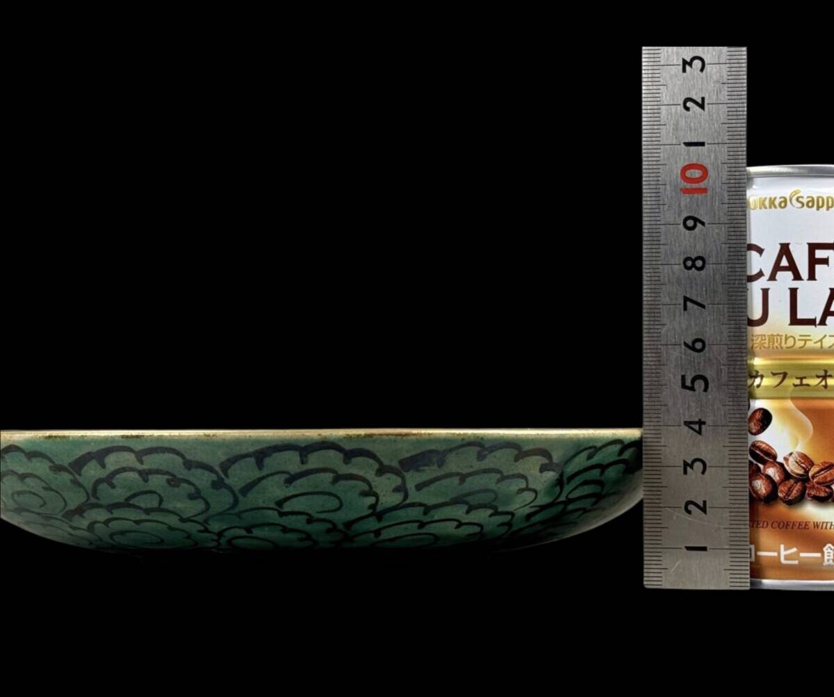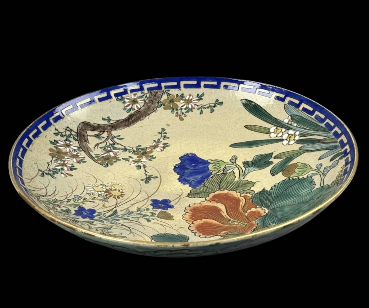 【偲】青九谷 金彩色絵 花文七寸皿 幅21.3cm 古九谷焼 飾皿 枝垂れ花と葵咲く色絵装飾 古九谷様式の華やぎと雅趣 j-199