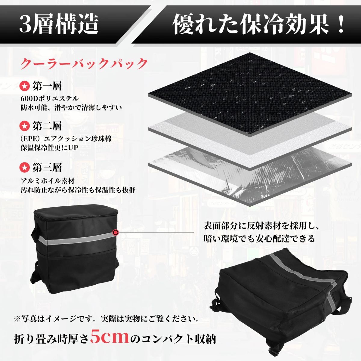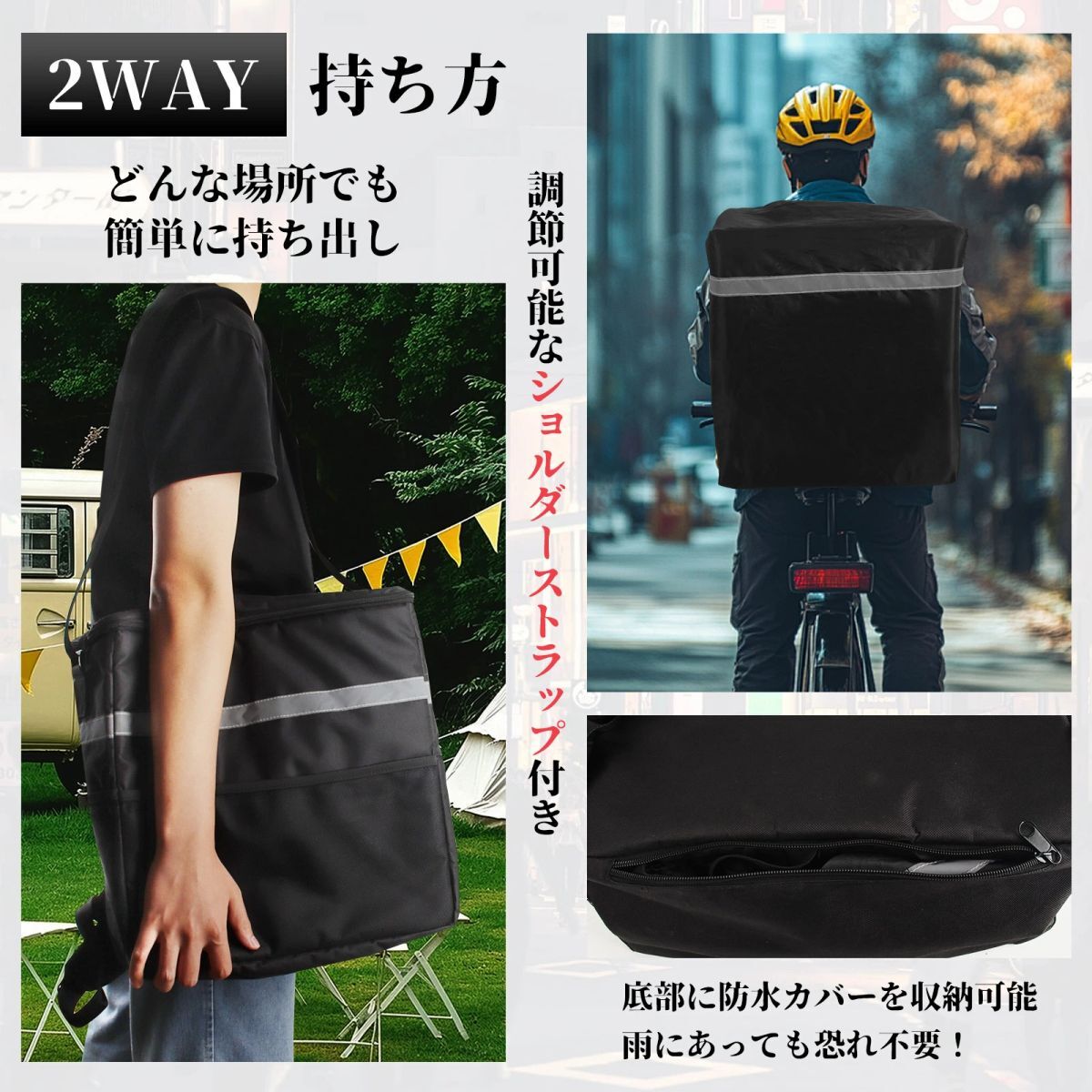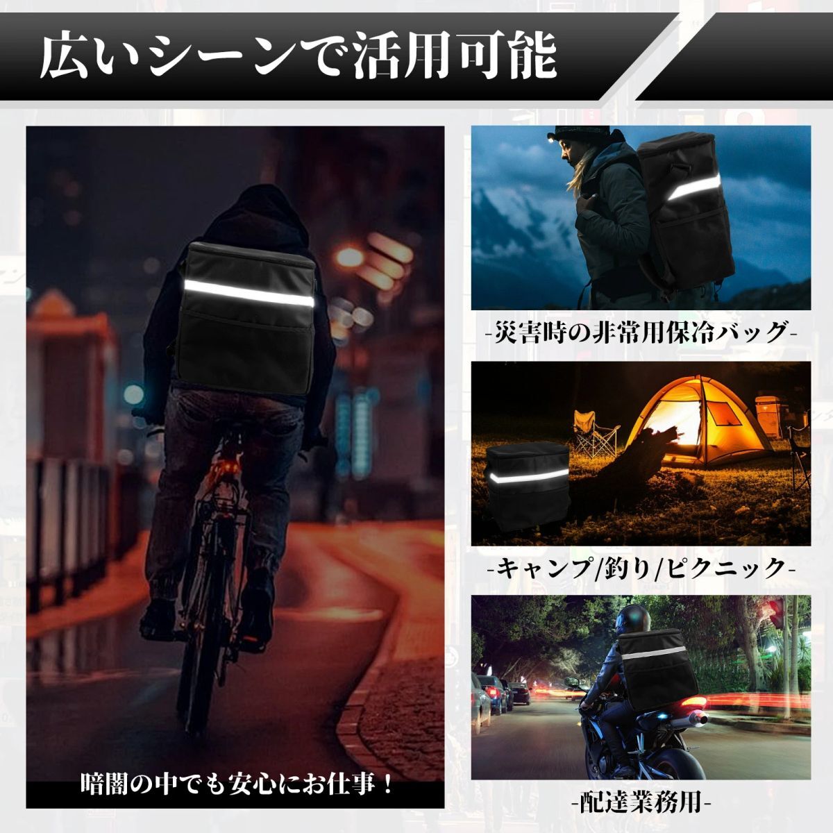 該当保冷バックパックはアウトドア、ピクニック、キャンプ、通勤、業務用(食品配送)など、幅広い用途で活用可能。デリバリーバッグとして使用時、外面は安全反射ストリップ付きので、光を反射できる視認性高い、夜の出行を守られます。