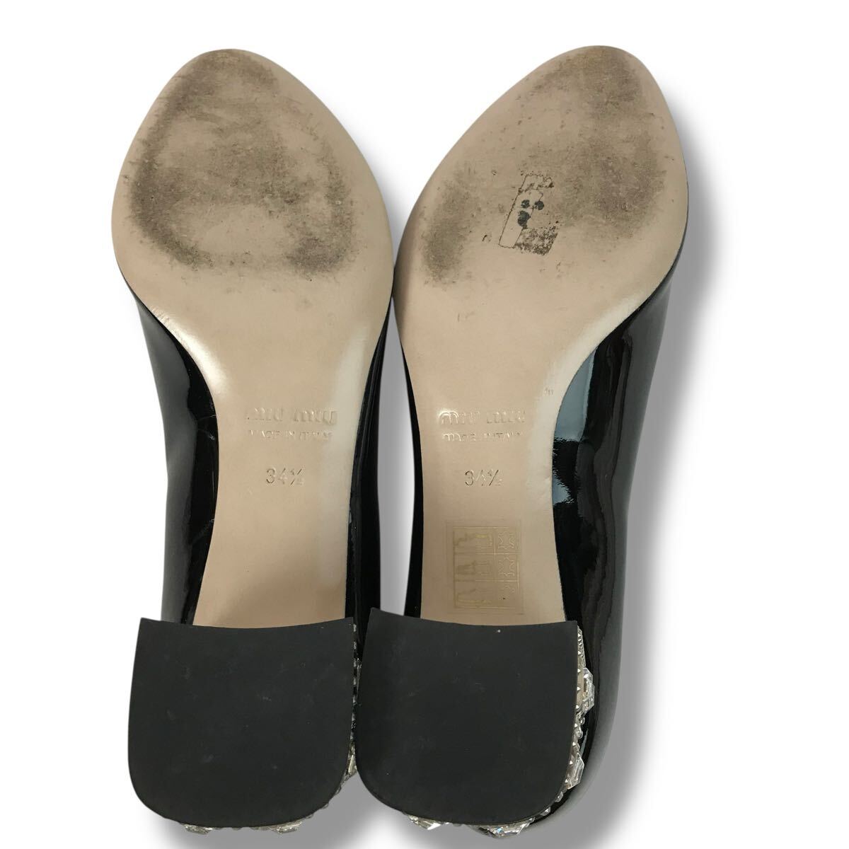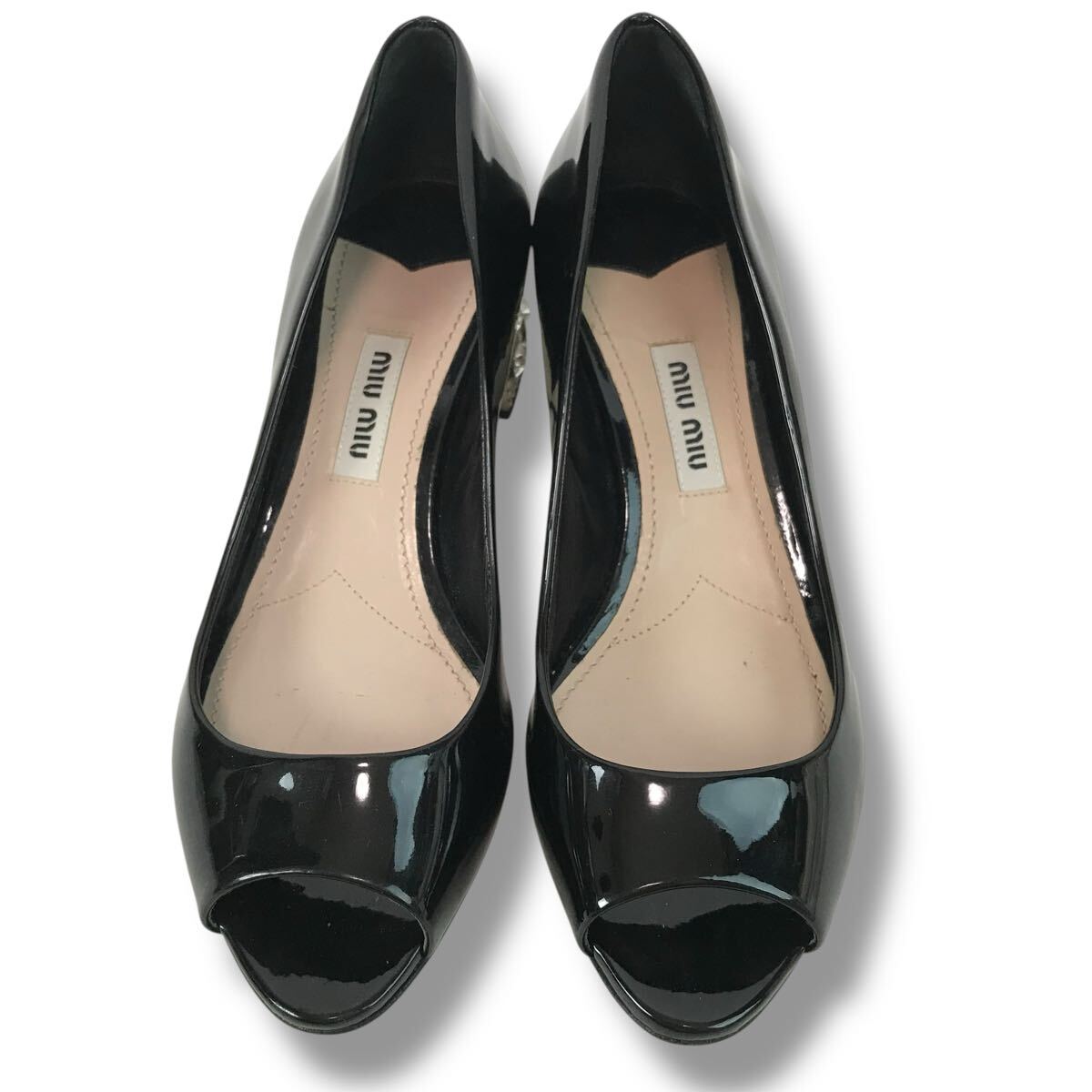 d77 miumiu ミュウミュウ ビジュー エナメル パンプス フォーマル ハイヒール オープントゥ ブラック フォーマル シューズ 34.5 正規品