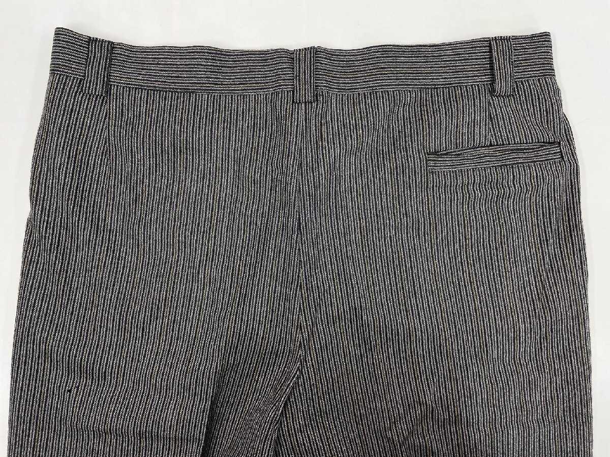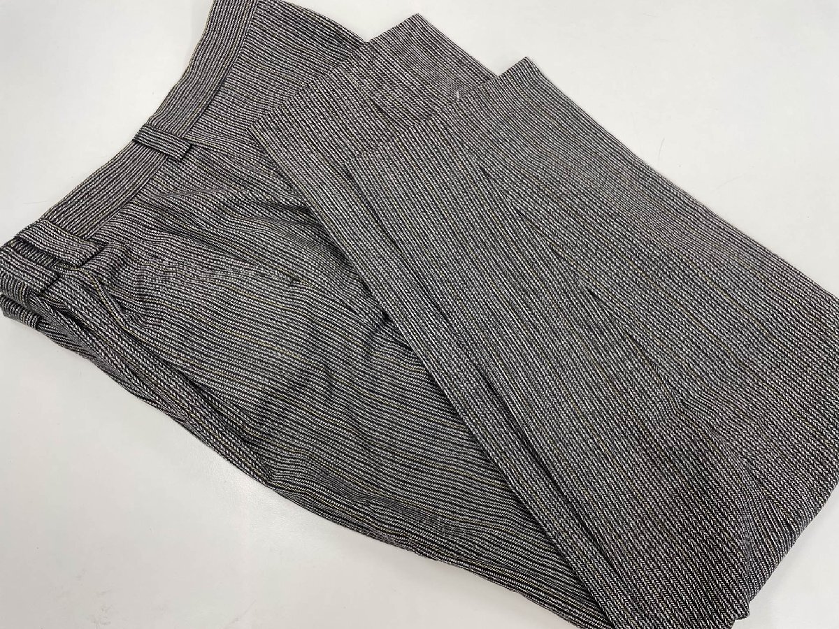・スラックス・・・ウエスト実寸約96センチ(0センチ出し、4センチ詰め可能)、股上約31~32センチ、渡り幅約39~40センチ、股下約83~84センチ、総丈約113センチ、裾幅約22センチ、シングル仕上げ(最大でプラス4センチ長くできます)