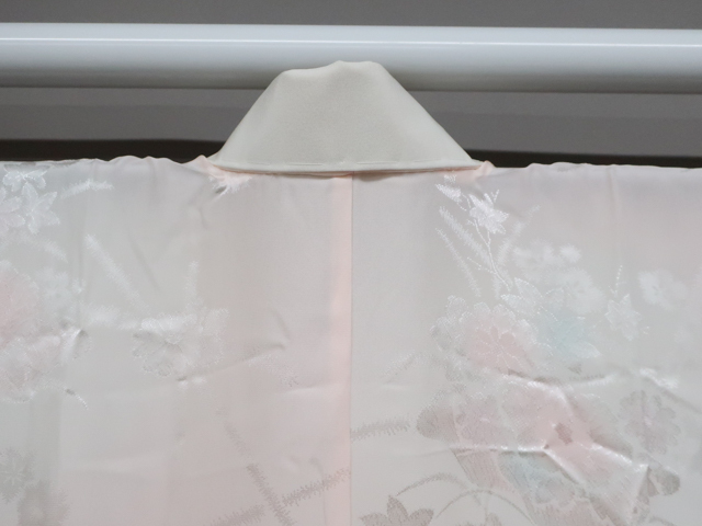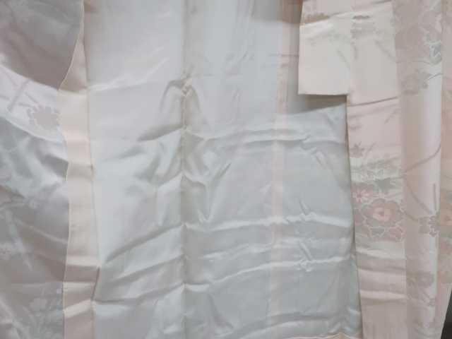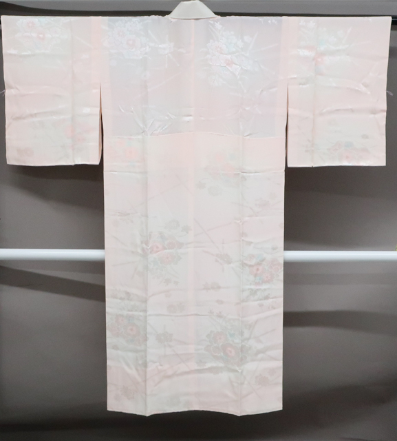 リサイクル商品ではございますが、大変良い状態のお品です。 居敷当て・半衿付きでございます。 地色は、薄ピンク です。 1枚目の画像が近いお色かと思われます。 素材は正絹です。 |