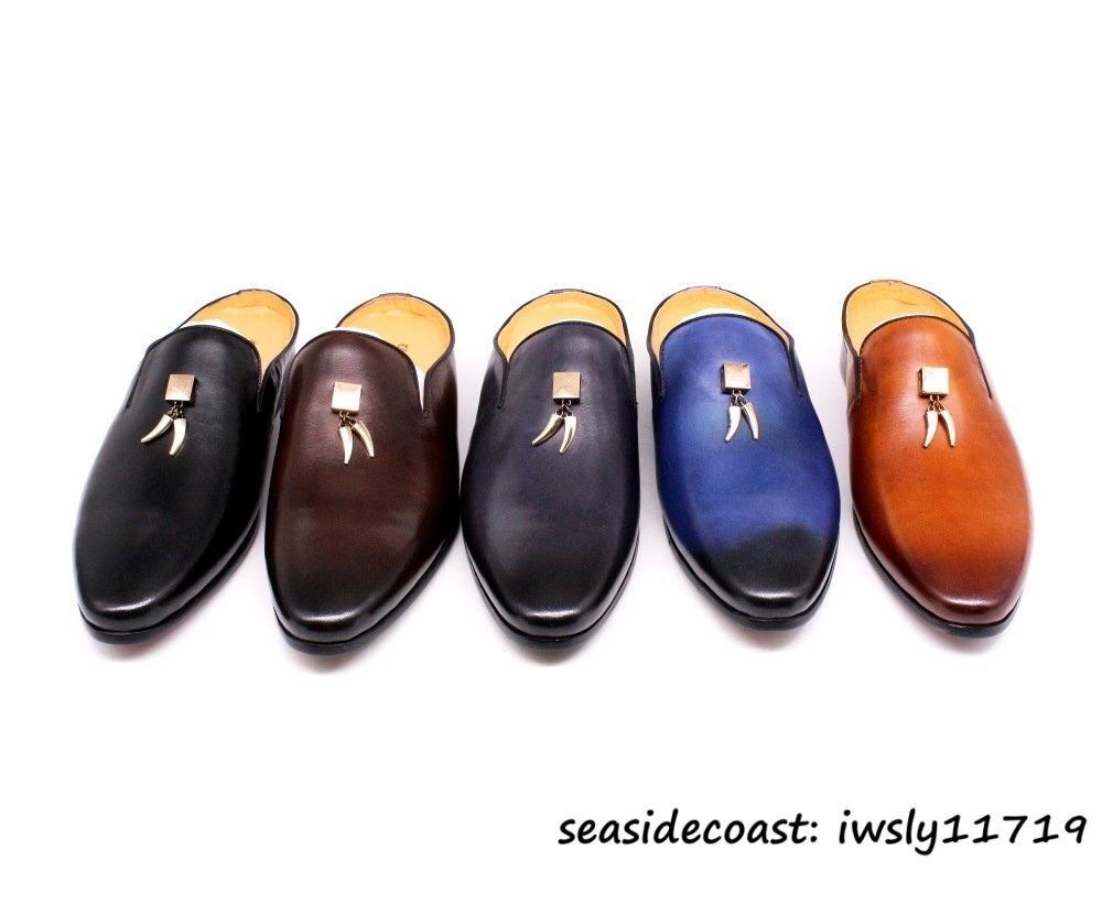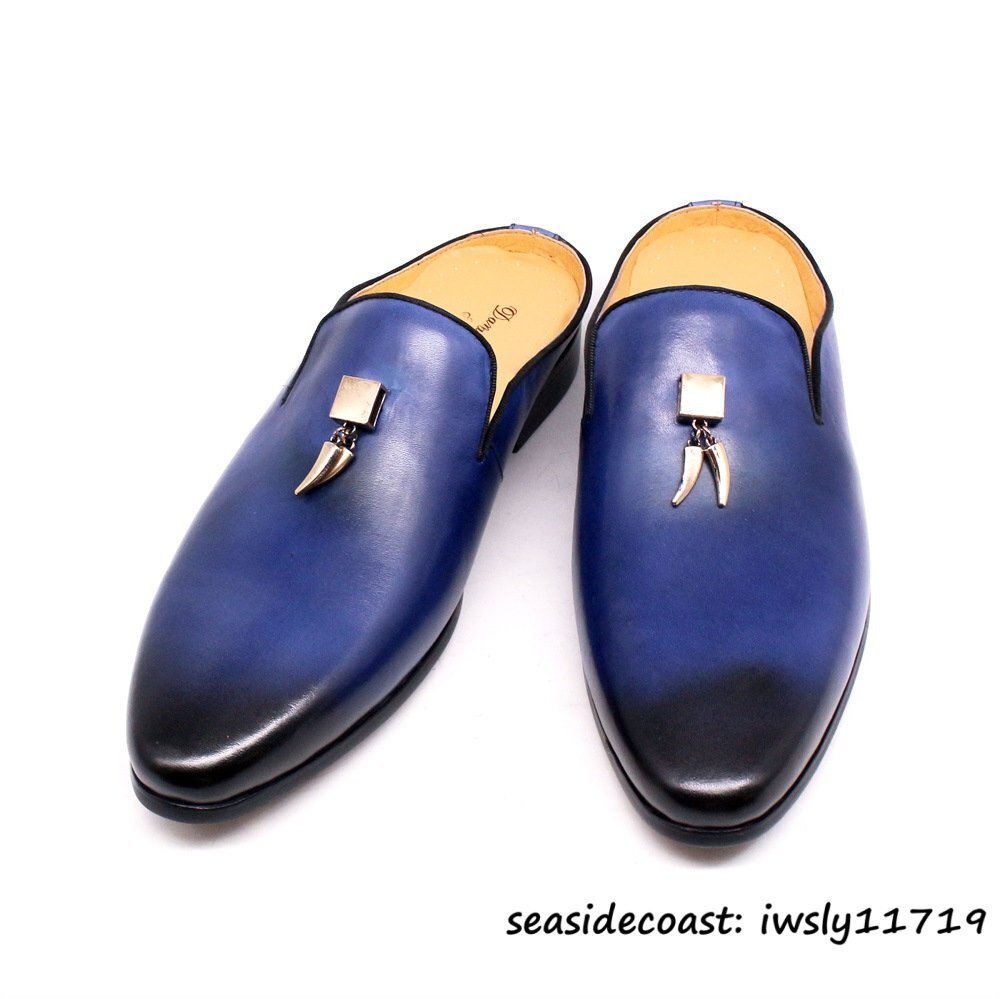 超希少★定価9万超 レザーシューズ 本革 サンダル ハンドメイド ビジネスシューズ スリッポン 紳士靴 牛革 革靴 スリッパ ブルー 24.5cm