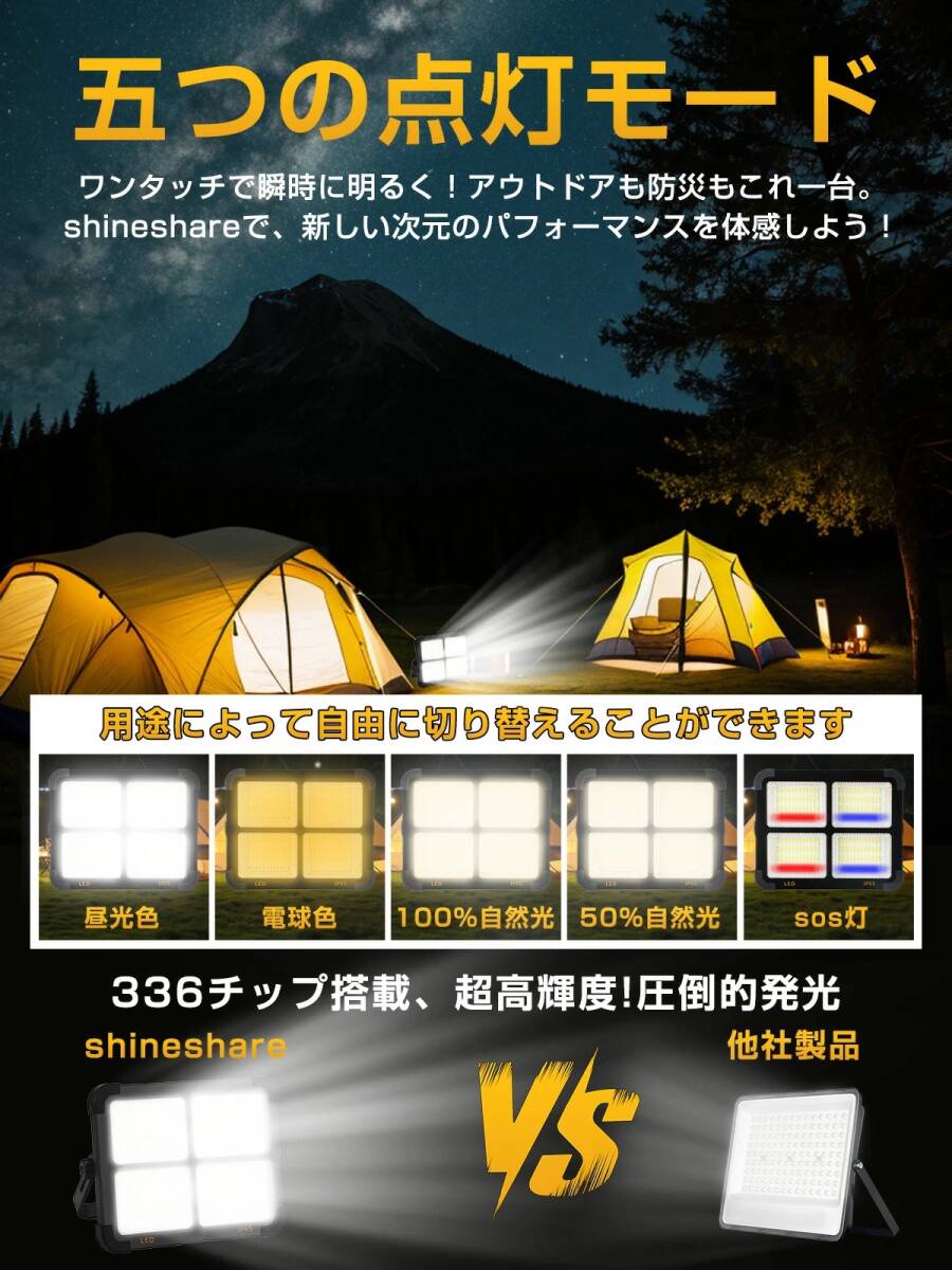 ライトは最新昇級版で、高輝度336個高品質SMDチップが搭載しています。点灯モード:昼白色、電球色、100%自然光、50%自然光、S0S灯が整備されています。120W相当で、特別設計されたブラケットは180度回転できて、取っ手や吊り掛けとしても使えます。注)ライトは曝光の効果がありますから、点灯中の光源を近くで直視しないでください。