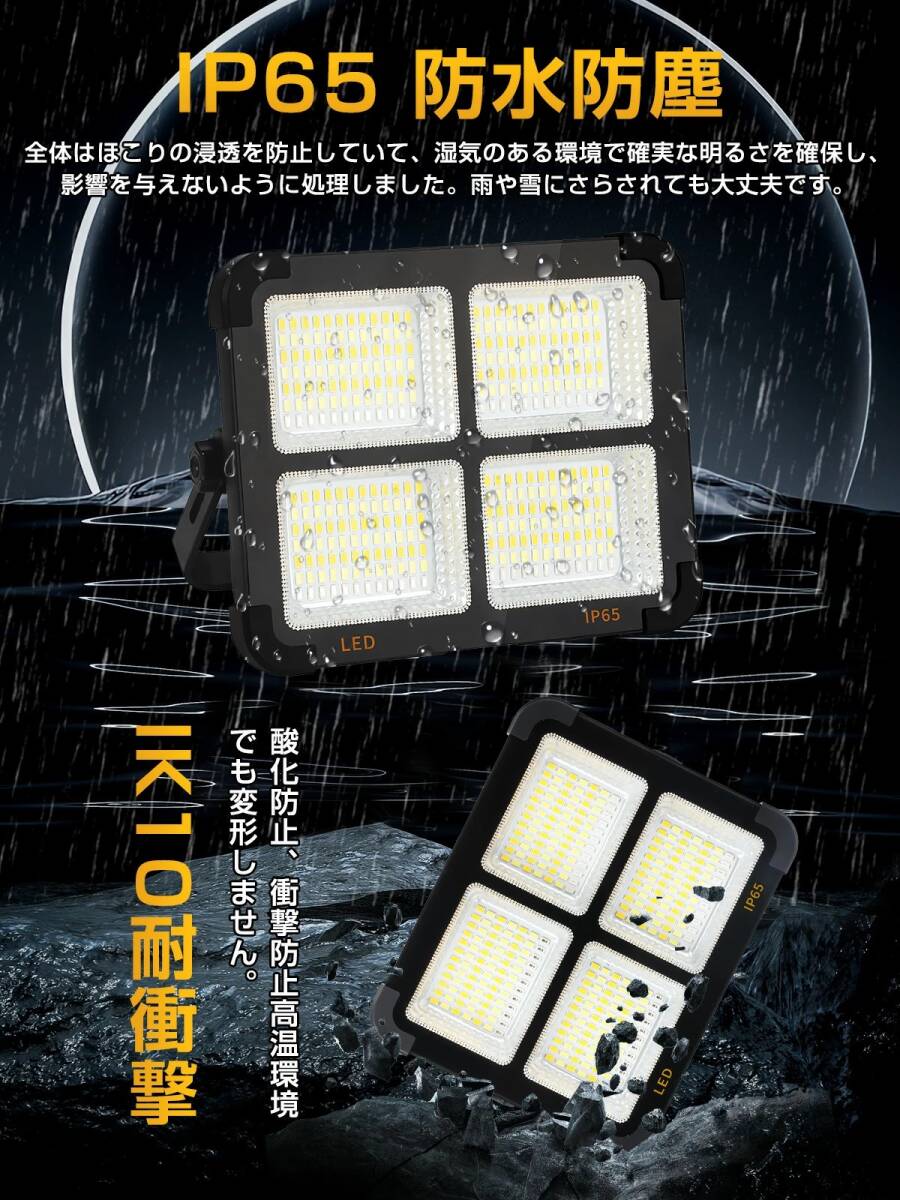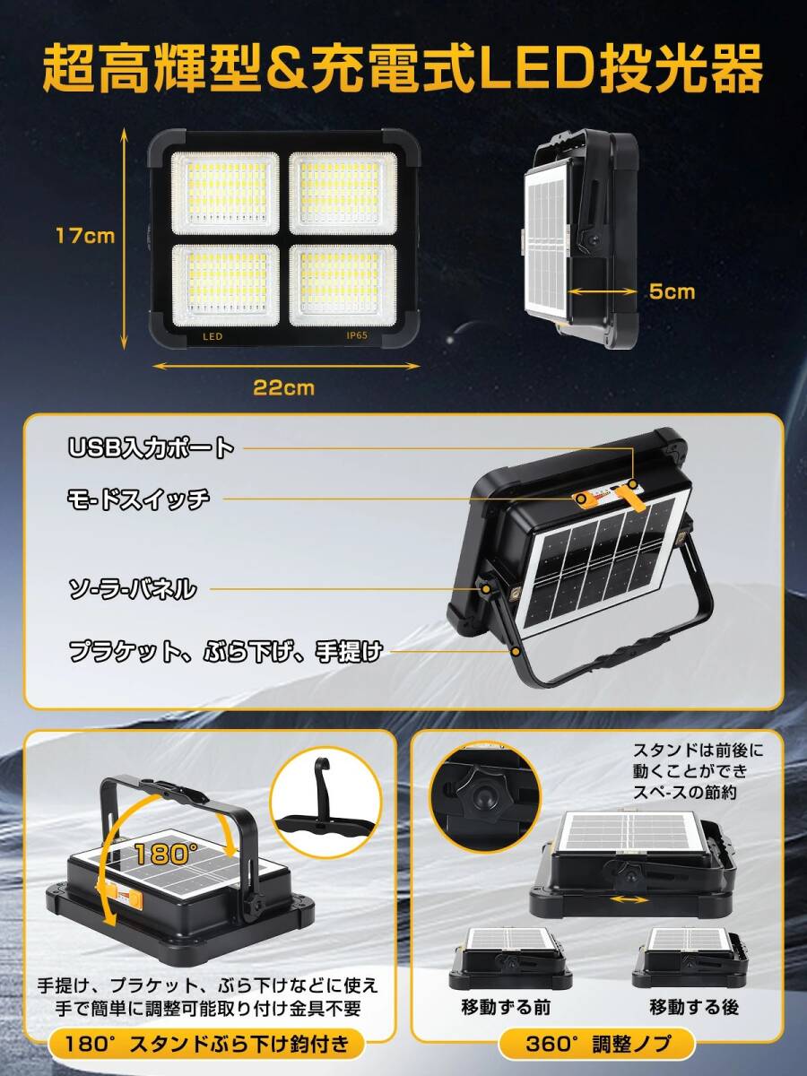 LED投光器は12000mah大容量電池内蔵し、USB充電6時間でフル充電できて、6-12時間稼働できます。USBポート付きまして、USBコード充電できます。ライトは大容量電池が内蔵して太陽光充電も可能なので、電気工事の時に、或は地震、台風などの災害の緊急時に停電してもライトは照明の機能が維持できます。