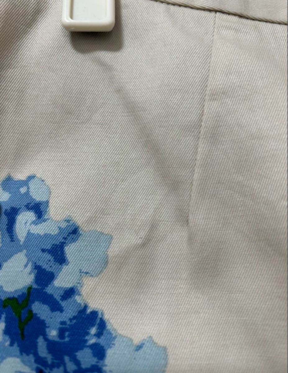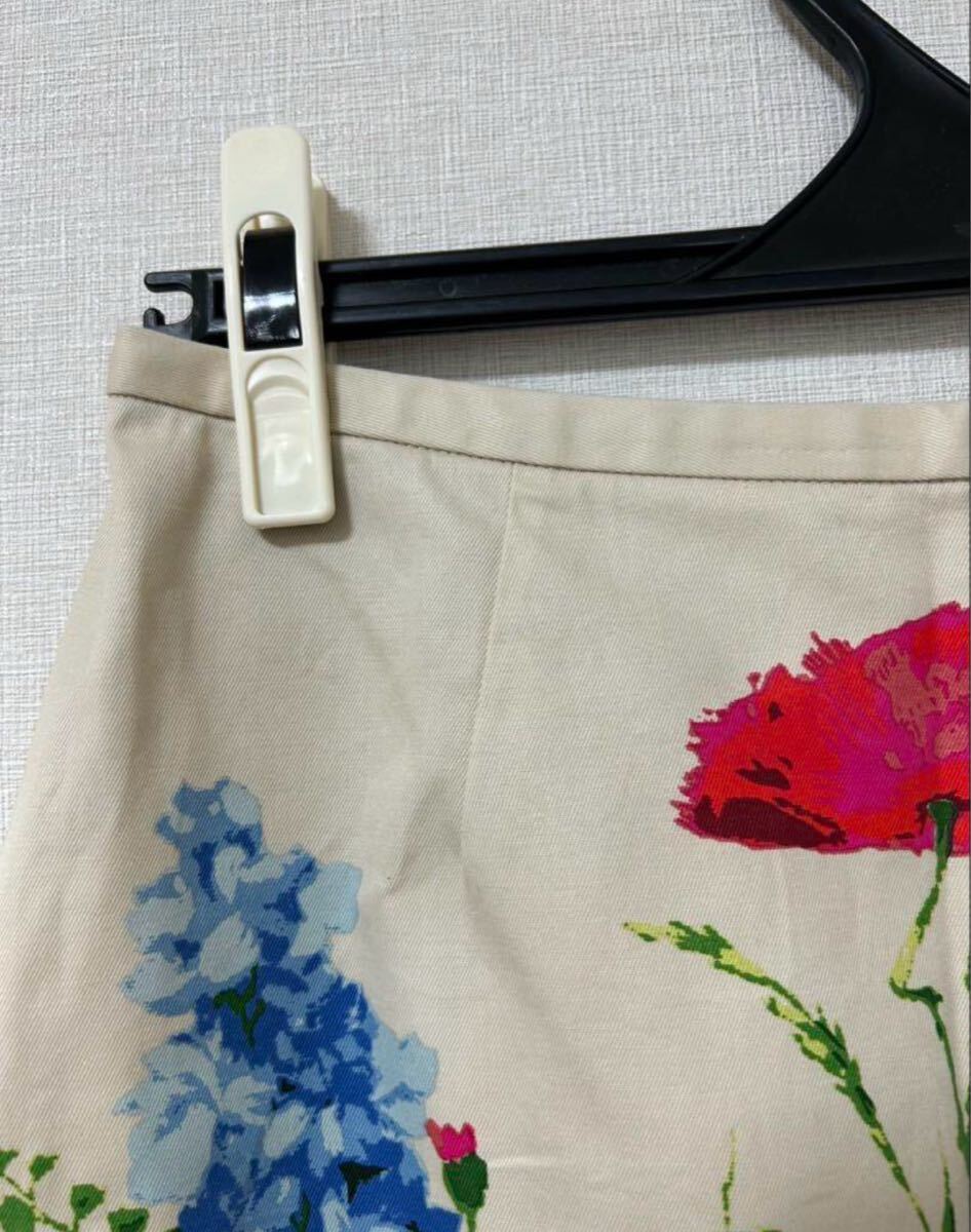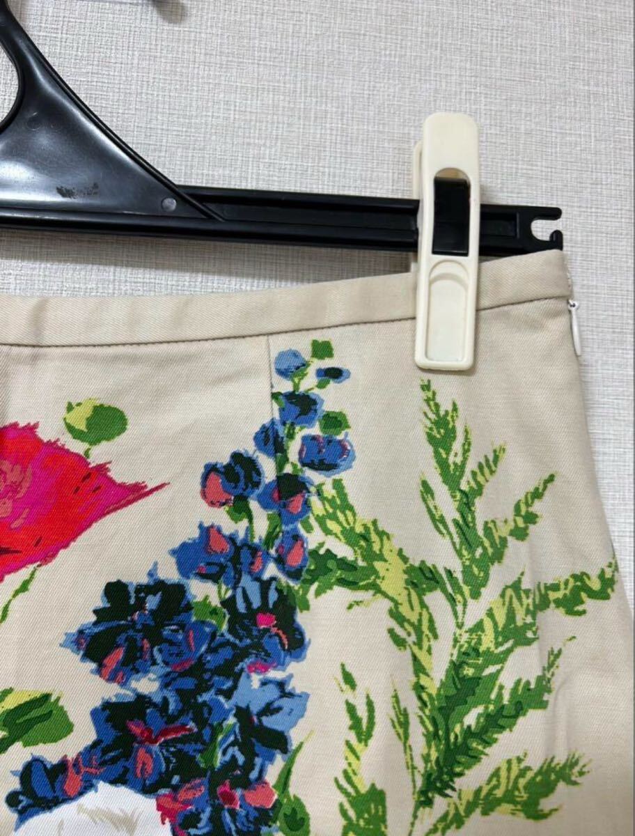鮮やかなフラワープリントのひざ丈スカート、コットン混合素材で快適な着心地。