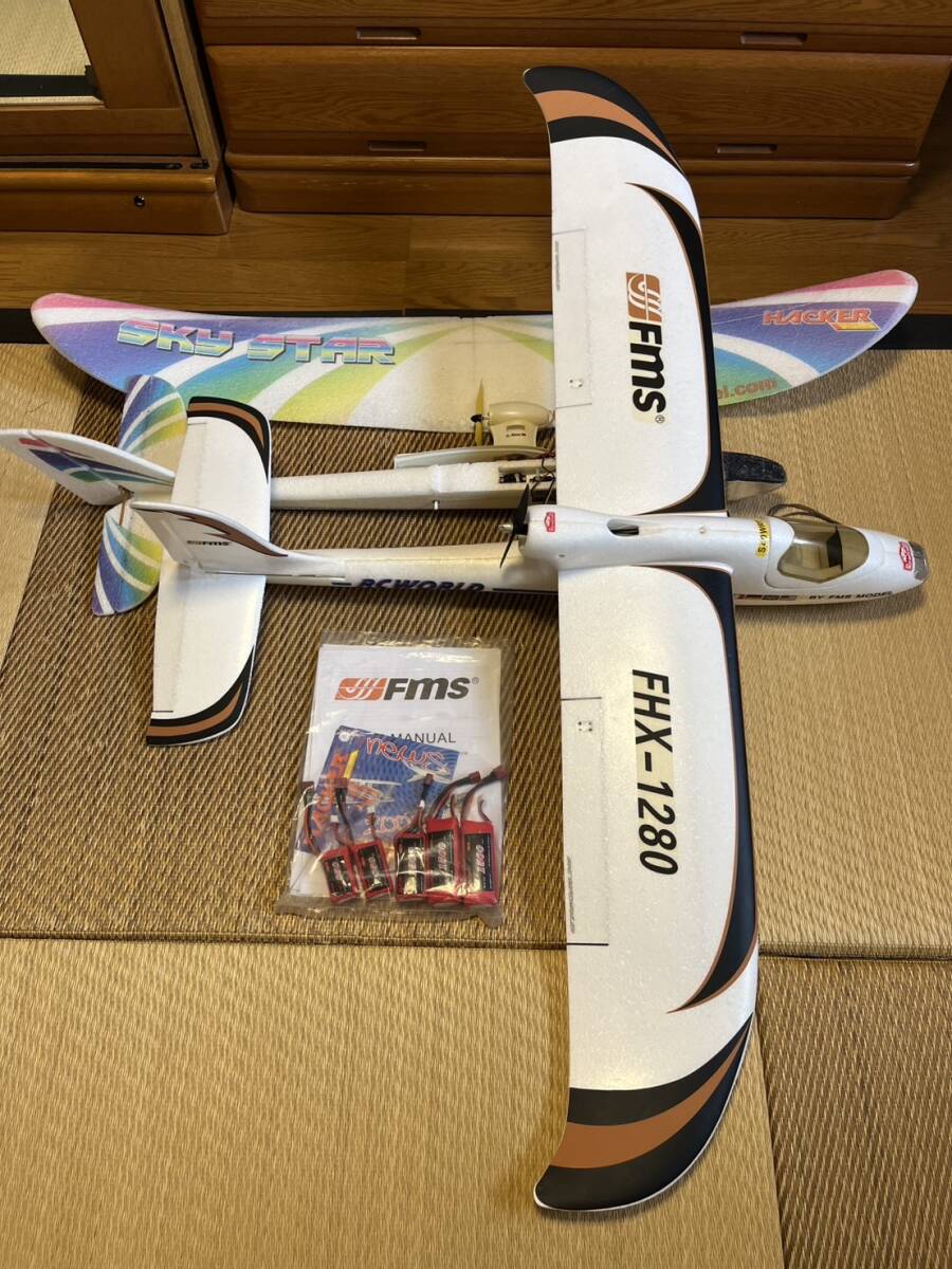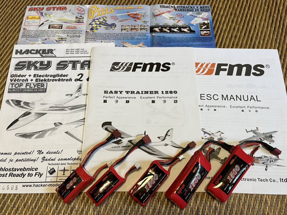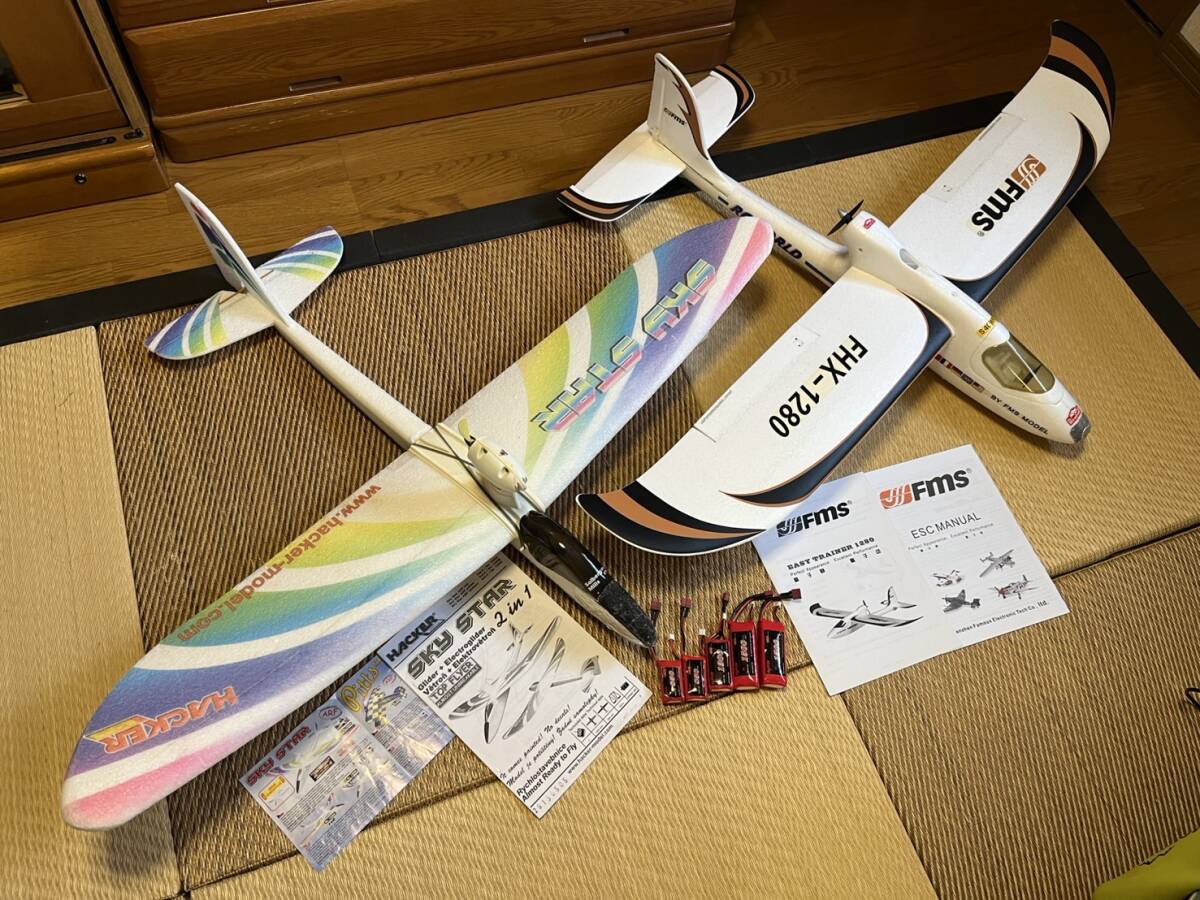 ラジコン入門機!FMS&HACKER トレーナー2機セット おまけ付きを出品いたします。 マニュアルも付属しますので安心です! 2機ともEPO製(強化発砲ウレタン)でブラシレスモーター、アンプ、サーボ付きです。 リンケージも済んでおりますのであとはお手持ちの送受信機が有れば即飛行可能です。 FMS1280の機体は主翼2分割でしたが接着しておりバラす事が出来ません。 この状態では梱包する事が出来ない為手渡し限定とさせて頂きます。 おまけに私が使用していたリポ電池もお付けいたします。(膨らみが見られますがこの状態で使用しておりました。自己責任でご使用ください。) ラジコンを卒業いたしますので出品いたします。これから始められる方、この機会にいかがでしょうか? ■商品詳細 1、FMS イージートレーナー1280 スパン1280mmのエルロン機です。 ブラシレスモーター、7.4Vアンプ、サーボ4個付き アンプT型コネクター仕様 主翼接着済みの為このままの状態で発送致します。 2、HACKER スカイスター スパン 1160mmのラダー機です。 ブラシレスモーター、7.4Vアンプ、サーボ2個付き アンプJSTコネクター仕様 主翼は分割できない ゴム止め式 墜落による機首部修理歴有り キャノピーも割れておりテープで補修 多少手直りによる補修が必要です。 3、リポ電池(KYPOM製 あくまでもオマケです) ・2セル 850mA 2個 ・2セル 1300mA 1個 ・3セル 1500mA 2個 | ||||