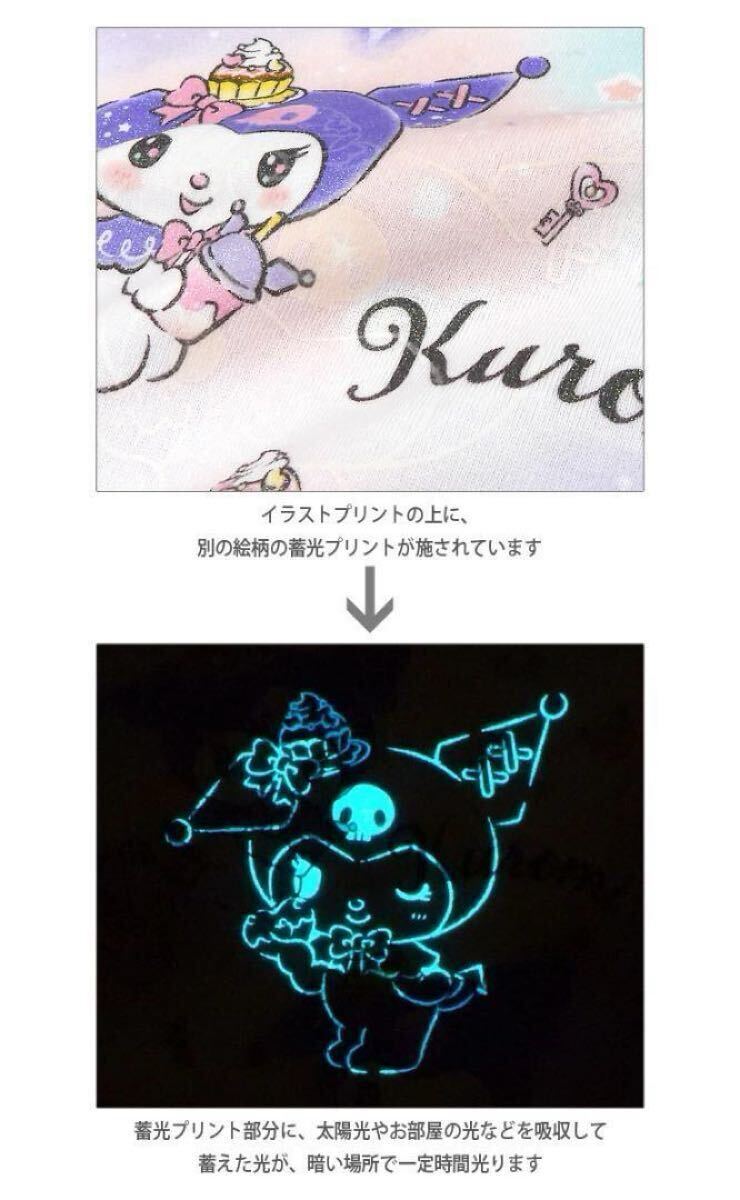 明るい場所ではラメプリントがキラキラと輝き、暗い場所ではキャラクターが浮かび上がるように光ります。