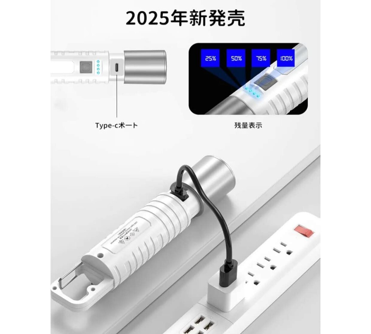 『バッテリー残量リマインダー』懐中電灯には大容量高性能リチウム電池が内蔵されており、1回の充電で5時間使用できます。懐中電灯の中央には 4 つの小さなライトがあり、使用中に徐々に消え、それぞれバッテリー残量が 100%、75%、50%、25% であることを示します。 TYPE-C ポート経由で充電する場合、小さなライトが点滅して充電の進行状況を示します。充電が完了すると、小さなライトが点灯したままになります。