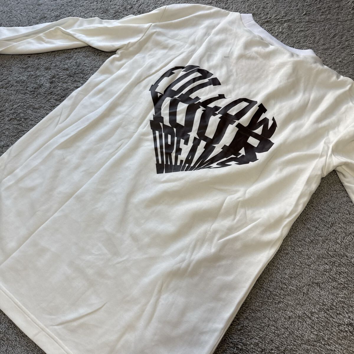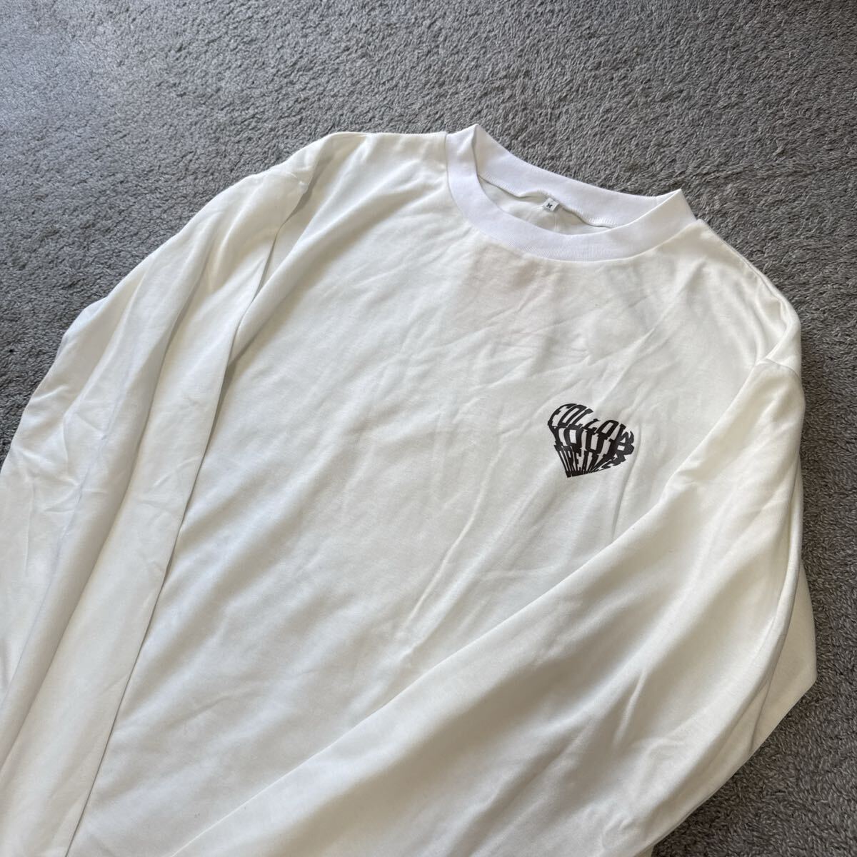 前後ハートロゴゆるめルーズ長袖Tシャツオフ白です。 未使用タグですがタグや品質ネームはついていません。 自宅保存なので細かい事を気になさる方は ご入札を避けて下さいね♪ サイズはMサイズです。 平置きで身幅56センチ 着丈75センチ 素人なので多少の差はご了承ください。 品質はポリエステル50% 綿40% レーヨン10%です。 実際のお色と画像は光の具合により 多少異なる場合があります。 | |||