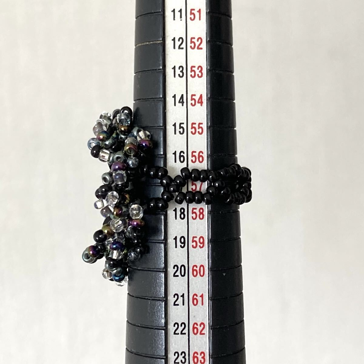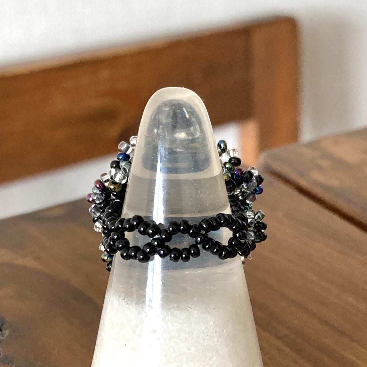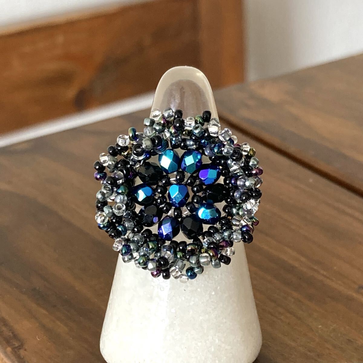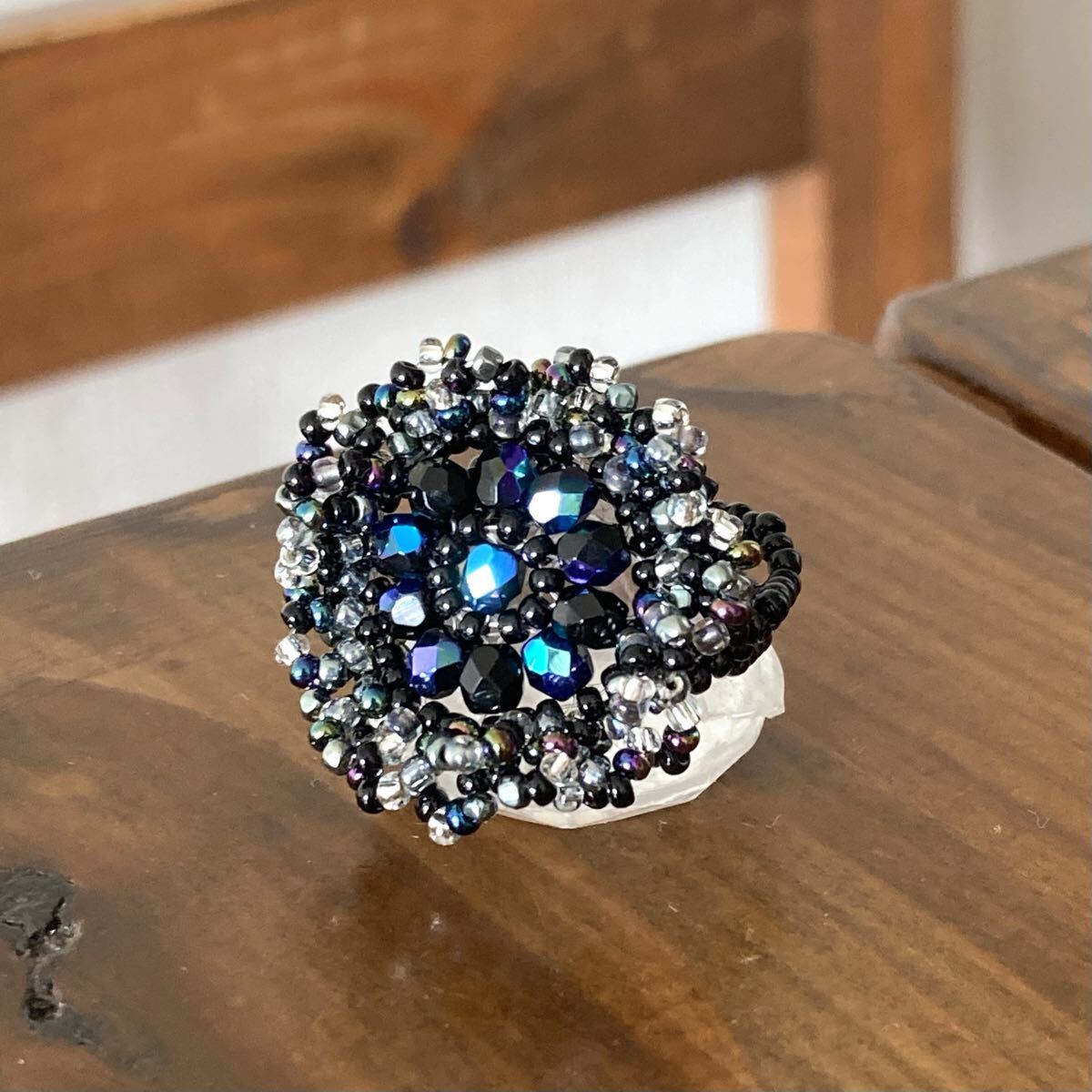 ビーズ リング 指輪 ハンドメイド 大きい丸型のレース風リング ブラックオーロラ×ダークミックス 16-18号です。