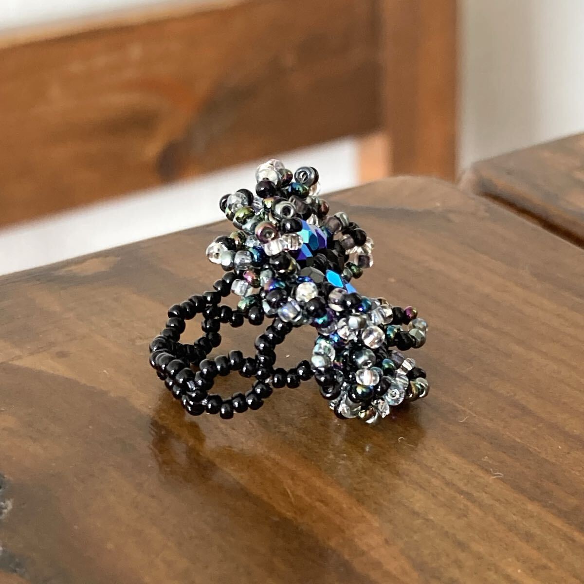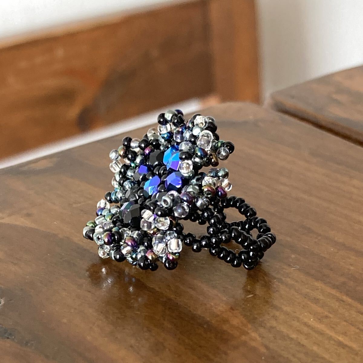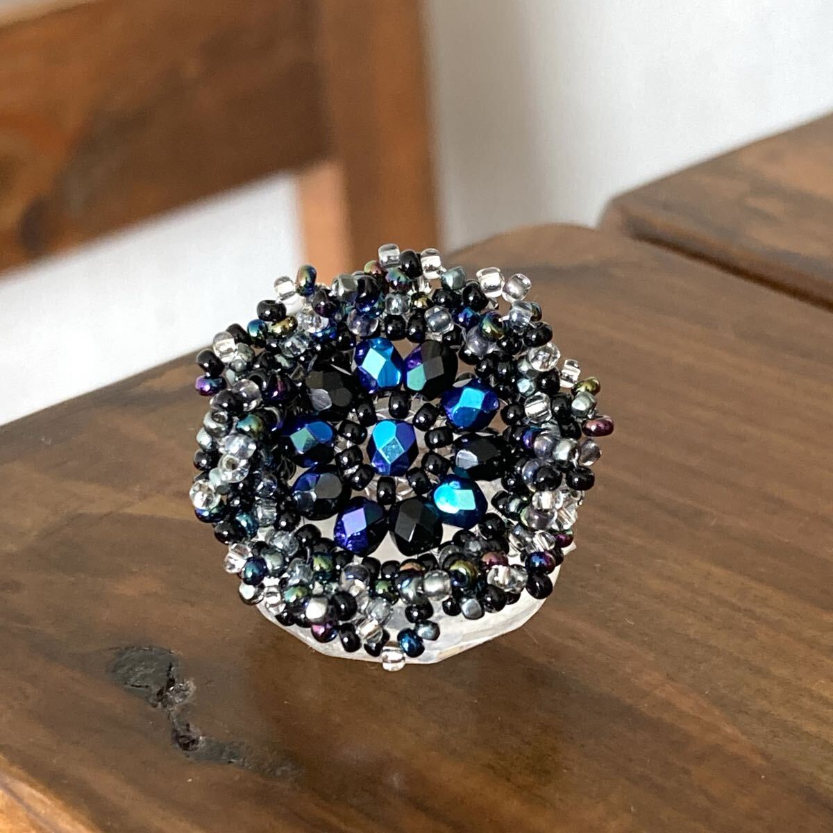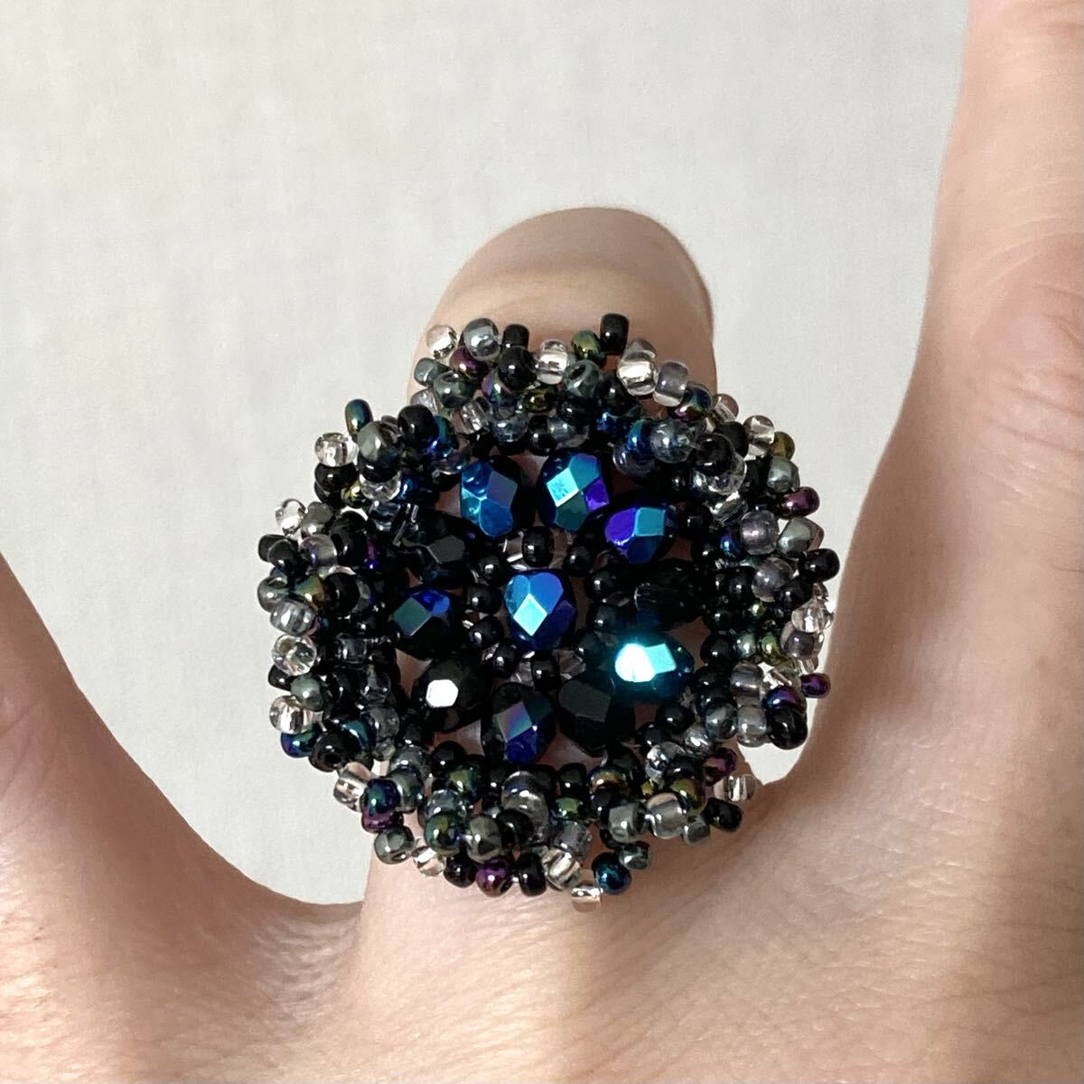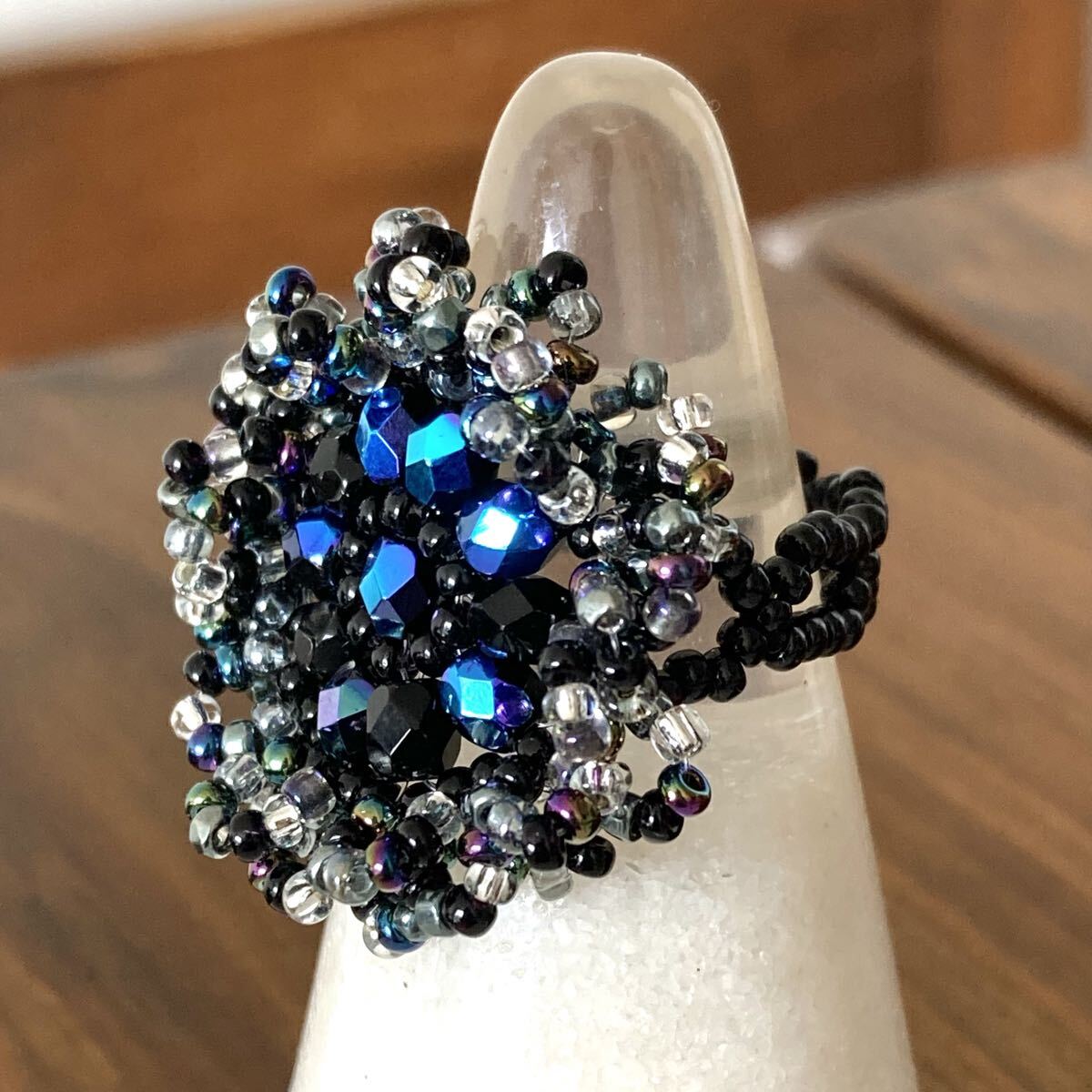 ビーズ リング 指輪 ハンドメイド 大きい丸型のレース風リング ブラックオーロラ×ダークミックス 16-18号です。