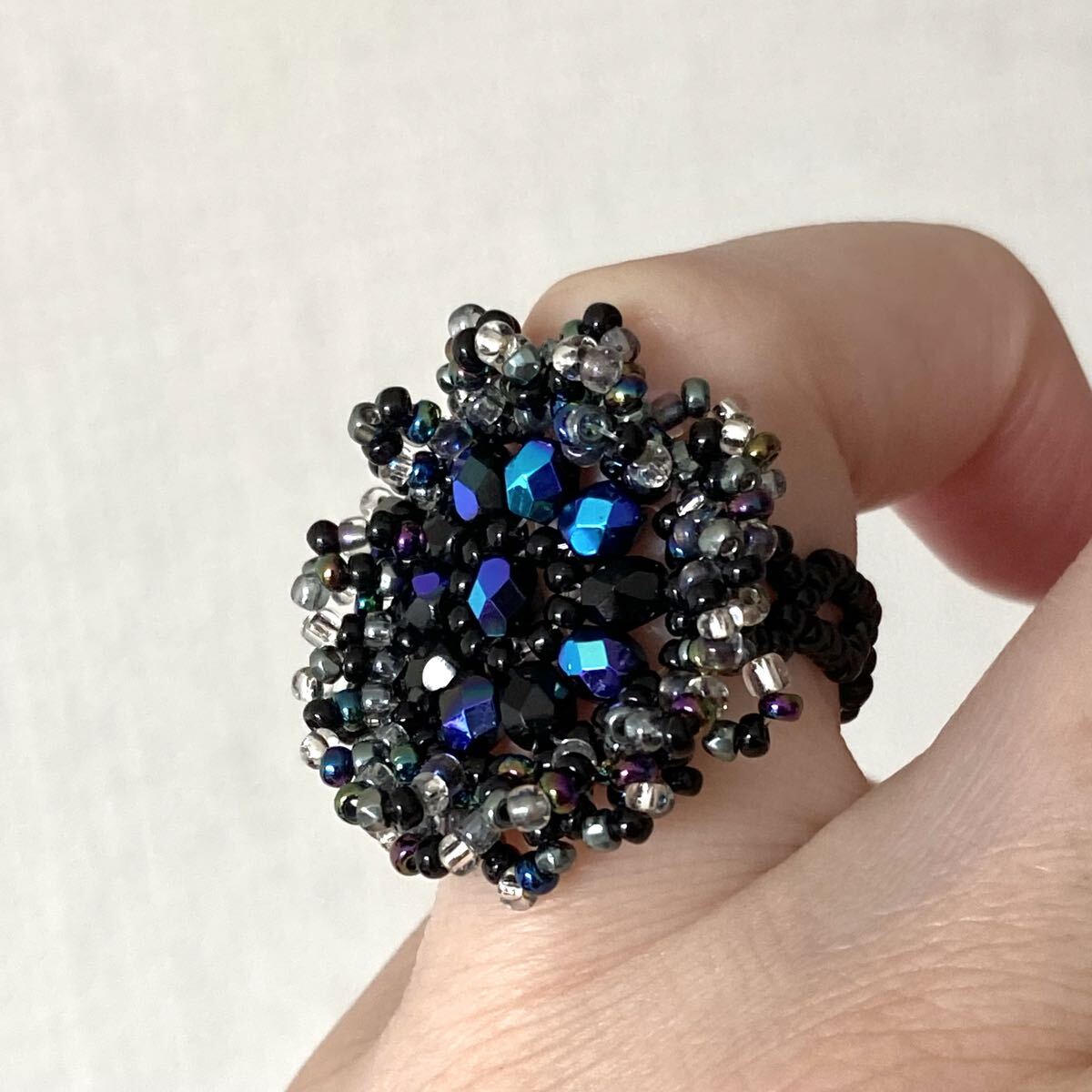 4mmのブラックオーロラのチェコビーズ、黒、グレー、玉虫色、メタリックブルー、クリアシルバーの丸小ビーズで作ったリングです。