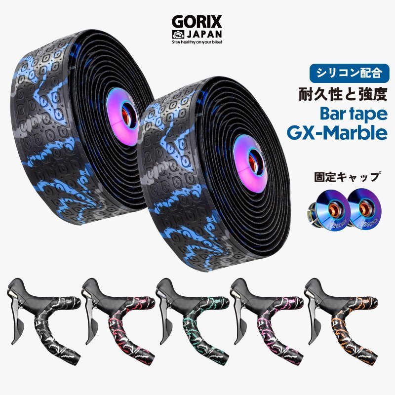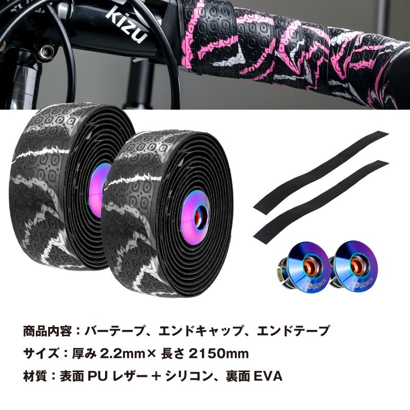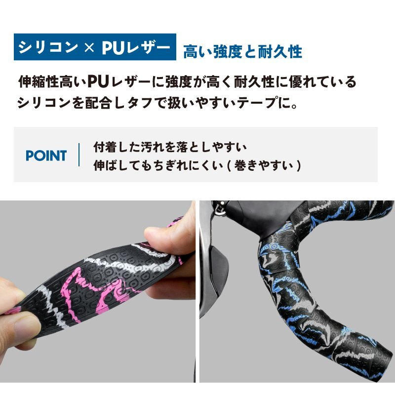 見た目にも印象が大きく変わるバーテープ。 機能性に優れ濡れた状態でも高いグリップ力を発揮! 伸縮性を残しつつ耐久性と強度を強化するためシリコンを配合。 タフで扱いやすい、また自転車のカスタマイズに適した柄デザインに仕上がっています。 [シリコン×PUレザー高い強度耐久性] 伸縮性高いPUレザーに強度は高く耐久性に優れているシリコンを配合しタフで扱いやすいテープに。 シリコンを配合する事で付着した汚れを落としやすい。そして伸ばしてもちぎれにくい(巻きやすい) [グリップ力] 雨や汗に濡れても優れたグリップ力を発揮し高いコントロール性を実現。 バーテープ表面には滑り止め加工が施してありグリップ力がさらに向上。 [感触] 感触の良い握り心地と程よい薄さで手に吸い付くような触り心地は長時間のライドも快適に。 厚み2.2mmでテープ表面はベタベタしない。 [衝撃吸収] 悪路やオフロードでの地面から受ける振動を抑える。 グラベルなどの未舗装路走行の自転車にも最適。 [柄デザイン] 個性を生かすマーブル模様でデザイン性高い柄。 見た目にも印象が大きく変わるバーテープで自転車カスタムも楽しめます。 [カラー豊富] ホワイトやレッド、ブルーの定番カラーから根強いカラーのチェレステやピンク、オレンジカラーも取り揃えています。 [固定式エンドキャップ] 紛失しにくく使い易いタイプのエンドキャップを採用。 綺麗でおしゃれなオイルスリックカラー。 先端技術のCNC加工法で作成し、頑丈で耐久性に優れています。 商品内容バーテープ、エンドキャップ、エンドテープ サイズ厚み2.2mm×長さ2150mm 材質表面PUレザー+シリコン、裏面EVA | |