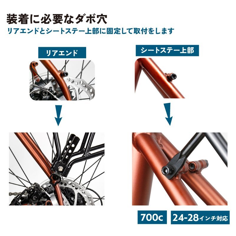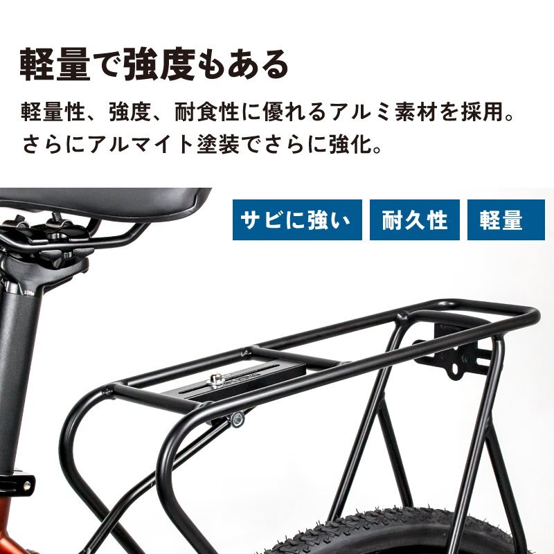 自転車荷台、自転車用リアキャリアを装着して荷物を沢山自転車に積載できる! 自転車通勤・通学やツーリング、旅行、お買物に最適なリアキャリアです。 キャリアを付ける事で背中に汗を掻いて不快な思いをしたり、長時間背負い体に負担を掛ける事も無くなります。 上下と前後に調整可能なので取付角度を柔軟に調整可能。 [アルミ素材] このリアキャリアは品質が良く軽量で耐食性に優れるアノダイズド アルミニウムを採用。 耐食性にも優れて錆びにくい。さらにキャリア表面をアノダイズド(アルマイト)塗装を採用しさらにサビに強く耐久性が向上。 滑らかな表面に仕上がっています。雨の日でも安心です。 [スマートなデザイン] シートステーに装着は1本ですっきりとしています。 全体的にすっきりとして細身な印象を与えてスマートに。 [超耐荷重] 最大耐荷重約25kg!重い荷物を積むことが可能。自転車通勤や自転車通学に最適です。 ツーリングで荷物が増えても安心。 [24-28インチに対応] 24-28インチ、クロスバイク、マウンテンバイク、折り畳み自転車等ほとんどの自転車タイプに適用します。 上下前後の調整が可能で柔軟に自転車にあったサイズで装着可能。 シートステーのダボ穴1点とリアエンドのダボ穴2点で固定します。 [簡単装着] 日本語説明書入りで装着は簡単に行えます。 装着に必要なダボ穴等をご購入前にご確認お願いします。 工具は付属していませんのでご用意下さい。 商品内容リアキャリア 荷台サイズ長さ40×幅12cm、高さ最大33cm 材質アルミニウム合金 最大耐荷約25kg 対応Vブレーキシステム、24-28インチの自転車に適用 《ご注意》 ・商品は入荷によりキズがある場合があります。 ・傷や細かい汚れが気になる方や神経質な方はご購入をご遠慮ください。 ・ディスプレイ環境により実物と色が異なる場合や、入荷時期により予告無く一部仕様変更する場合がございます。 |