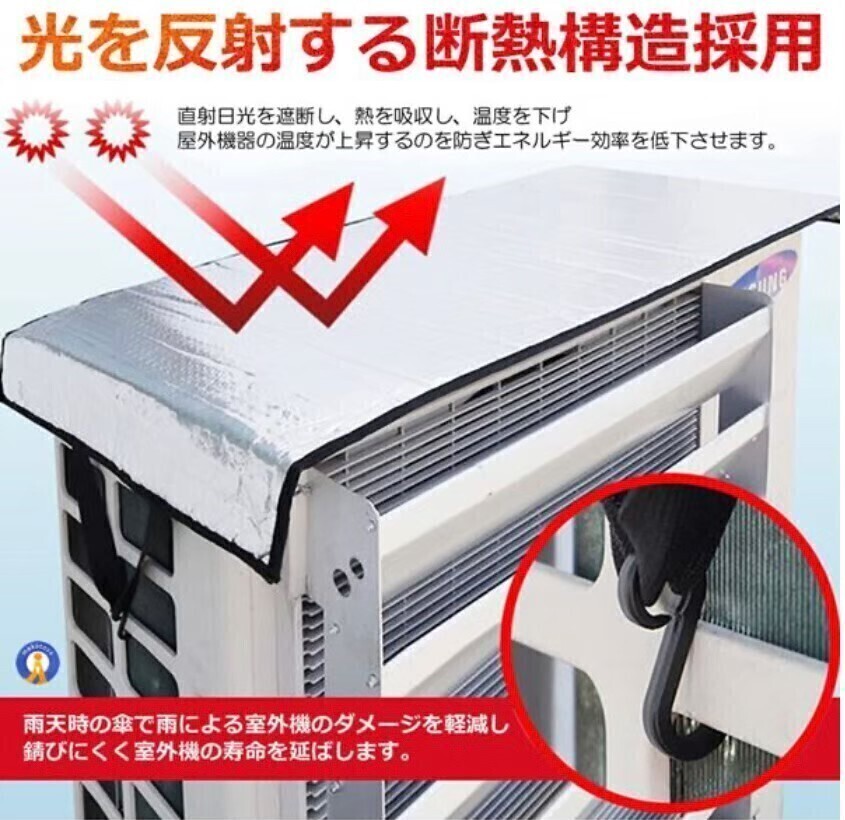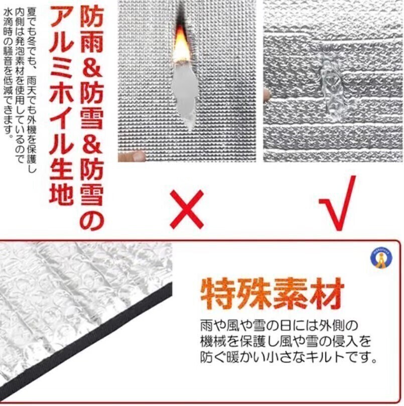 防雨・防雪のアルミホイル生地で、夏でも・冬でも・雨天でも、室外機を保護します。内側は発泡素材を使用しているので、水滴時の騒音を軽減できます。