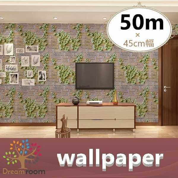【 50m 】 3D レンガ×葉っぱ リーフ ウォールペーパー ビンテージ 石垣 ストーン 壁紙 北欧風 インテリア はがせる シール DIY
