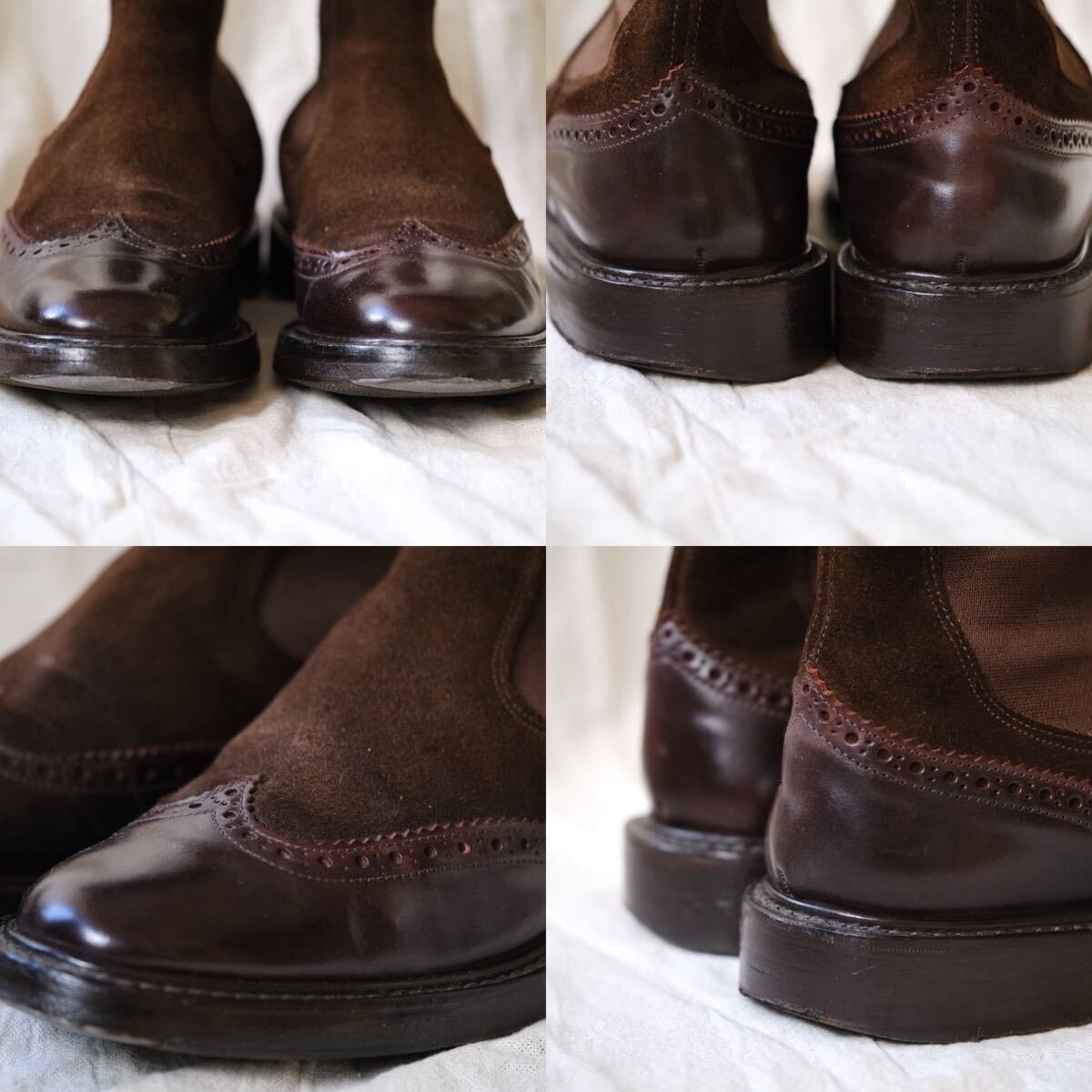 焦がしたような加工が施されたオイルドスエードレザーで擦ったりして摩擦を加えることにより、革の表面の色が変わり、革に陰影を作り出すヴィンテージの経年変化を楽しむレザーとホーウィンコードバンのコンビネーション。希少性随一のスペシャルブーツです。
