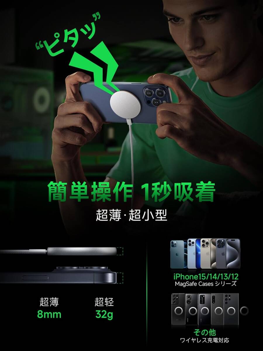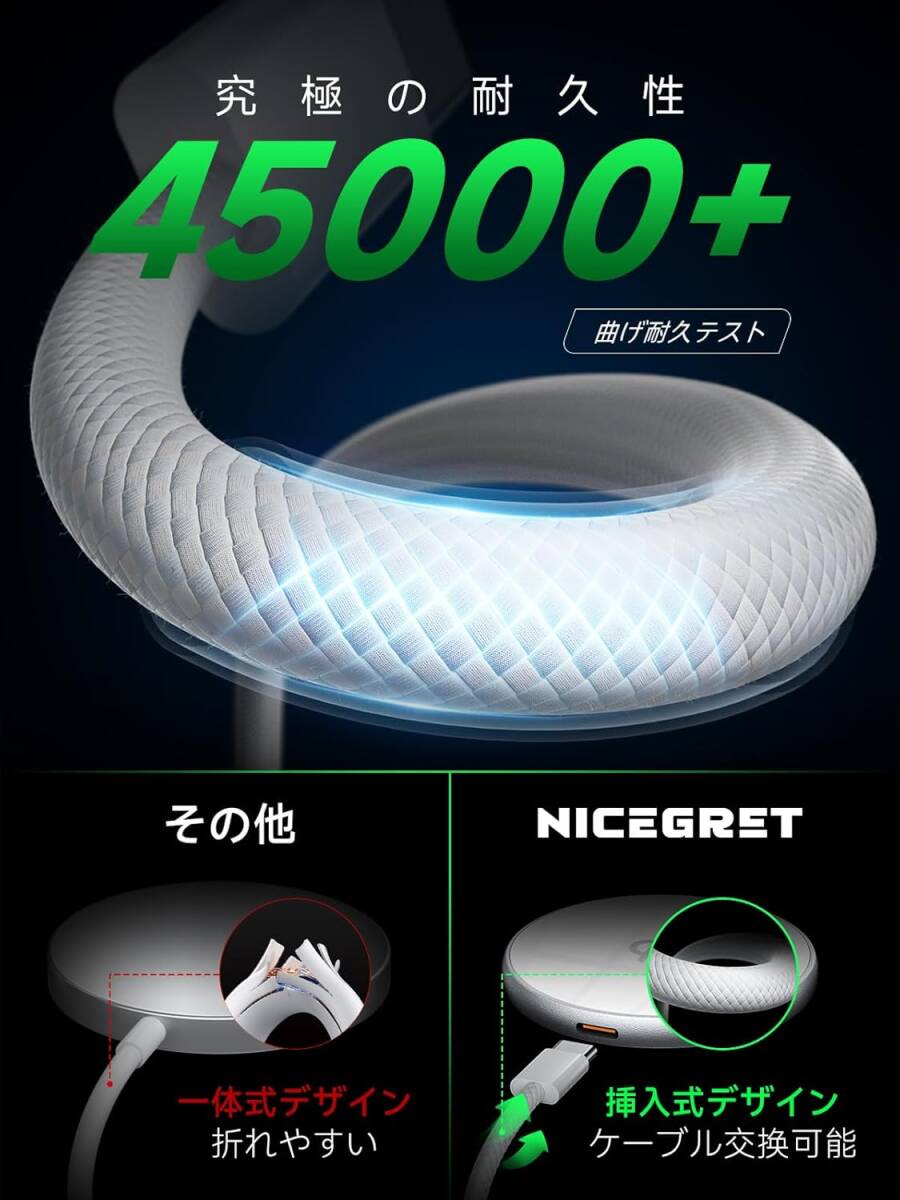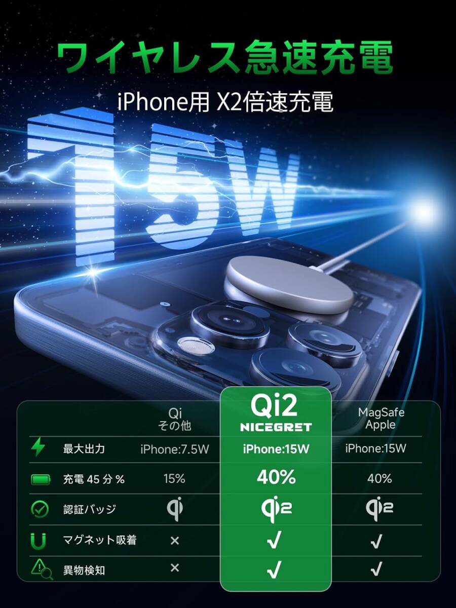 A22A この商品について 【A-pple公式Qi2認証 15W 急速充電器】Qi2はA-ppleとワイヤレス充電連盟(WPC)が制定した最新のワイヤレス充電器規格で、iPhoneのワイヤレス充電速度を7.5Wから15Wに倍増させます。qi2 充電器はわずか45分でiPhone 15を40%まで充電できるのに対し、Qi1充電器は15%までしか充電できません。これにより、貴重な時間を大幅に節約できます。NICEGRETは、最初のQi2公式認証を取得した企業の一つです(QI-ID:21304)。数ヶ月にわたる精密な開発と455,734人以上のユーザーからのフィードバックを経て、急速充電、強力な磁気吸着、安全性、美しさ、便利さを兼ね備えた「magsafe充電器」を誇りを持ってご紹介します。これにより、あなたのワイヤレス充電体験が新しい次元に引き上げられます!
