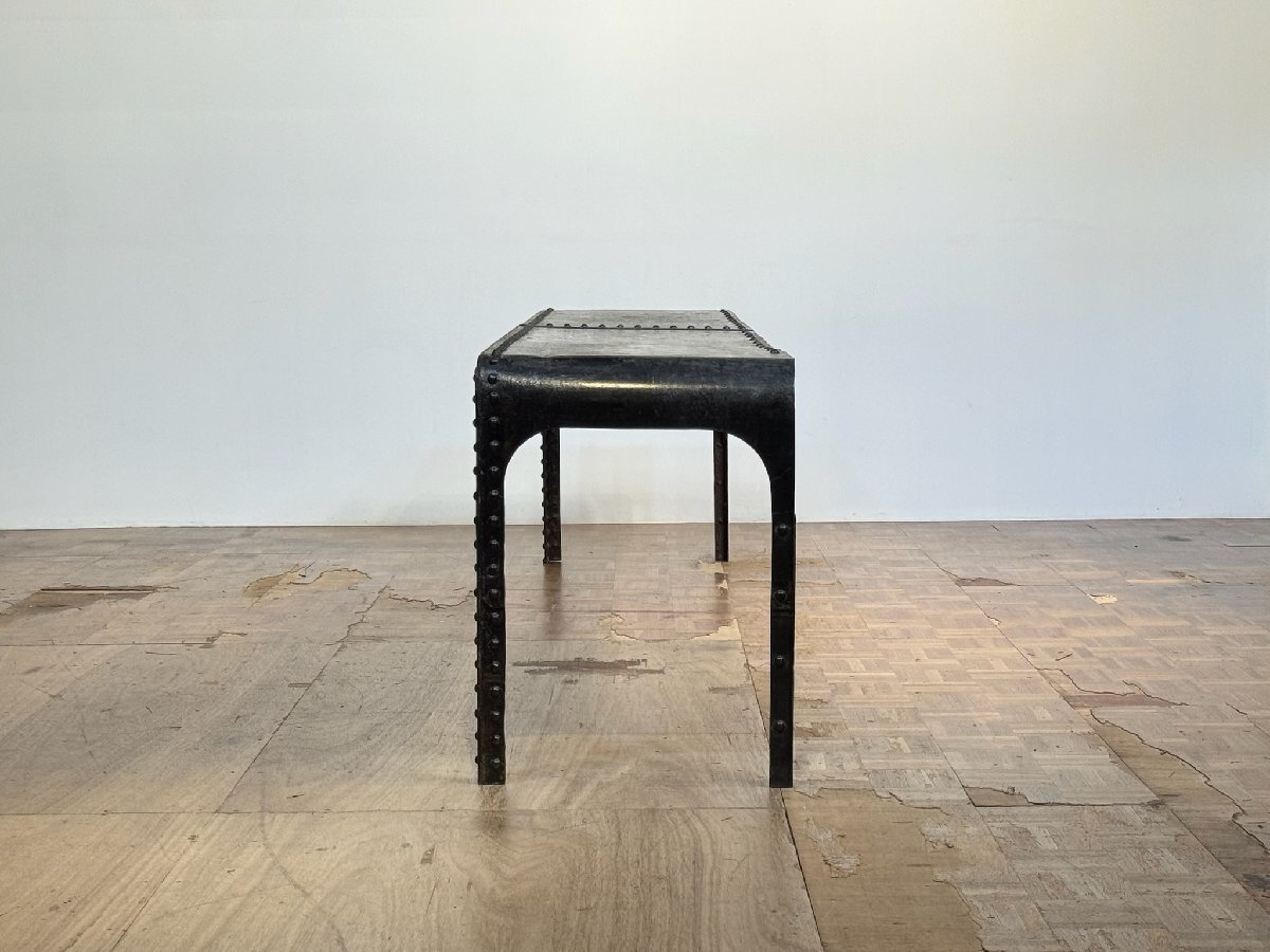 荒々しいアイアンのテクスチャーや表情もさることながら、天板とレッグスの構成にスチール材でも緊張感の走る超ストイックで野心的な設計を用いた、軽やかさと無骨さを具有したクリエイション。