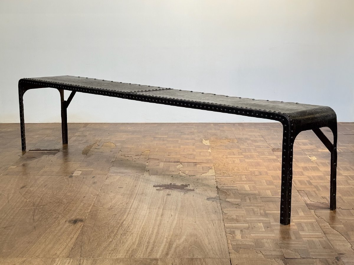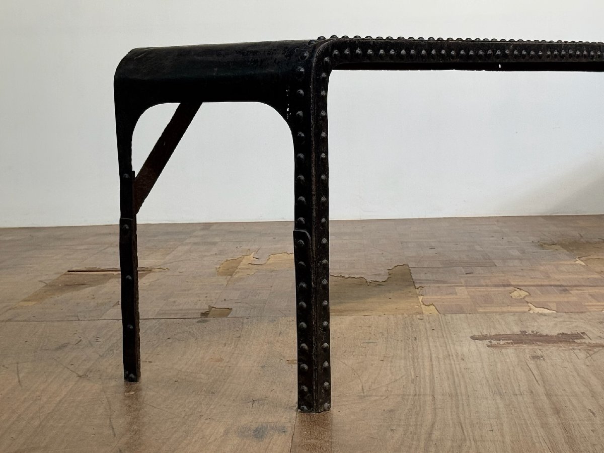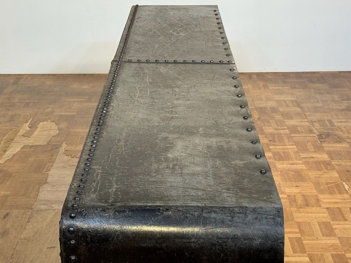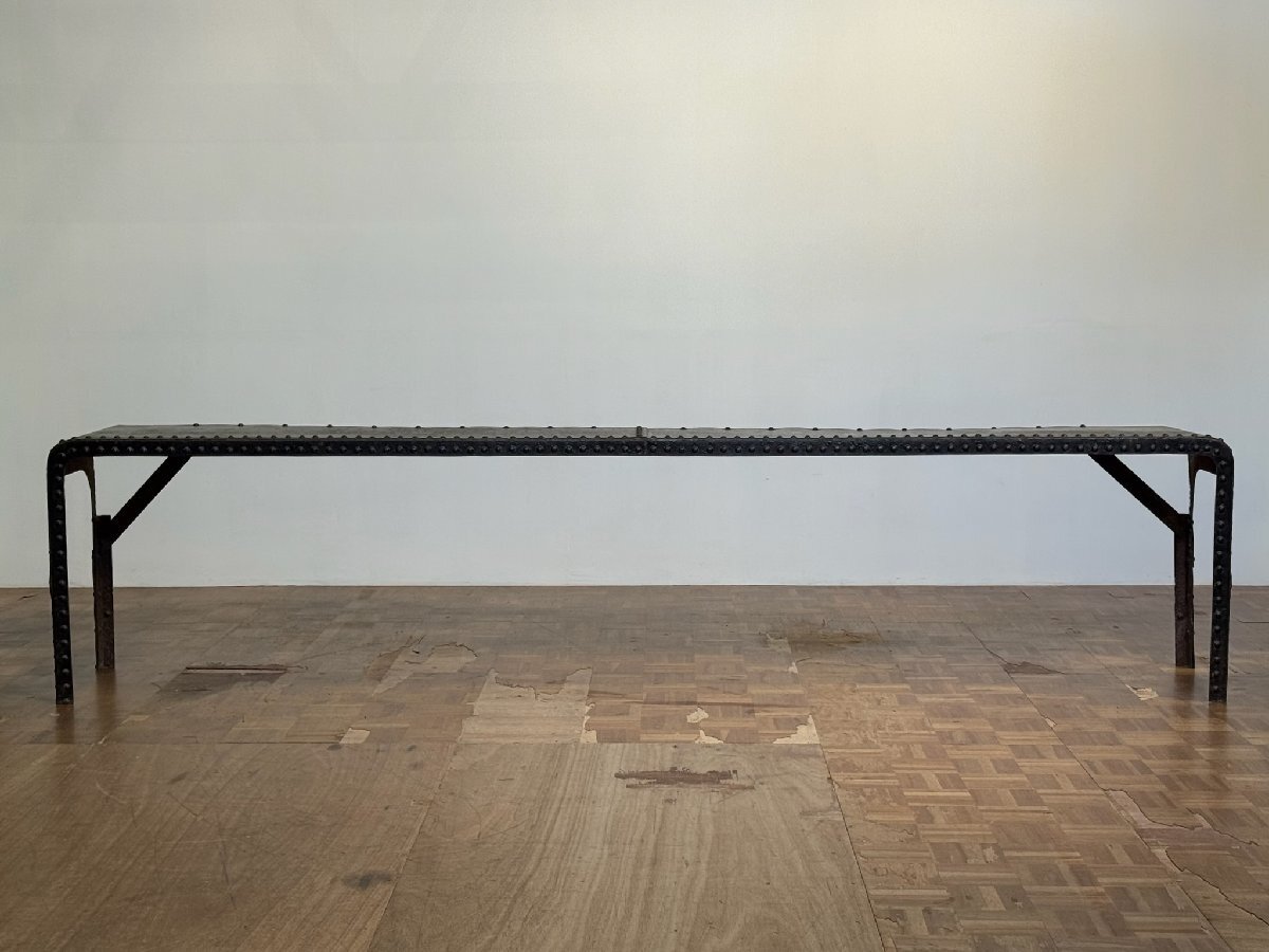 プロダクトを構成する全部位 / 全パーツを堅牢なスチール材で構成し、3000mmを超えるサイズをプロダクト両端のレッグスだけで支える超ストイックな構成を、強度を保持しつつデザインチャームとしても美しいリベット固定で飾り上げた、コンソールテーブルロングシェルフラック。1960~70sフランスヴィンテージ品。