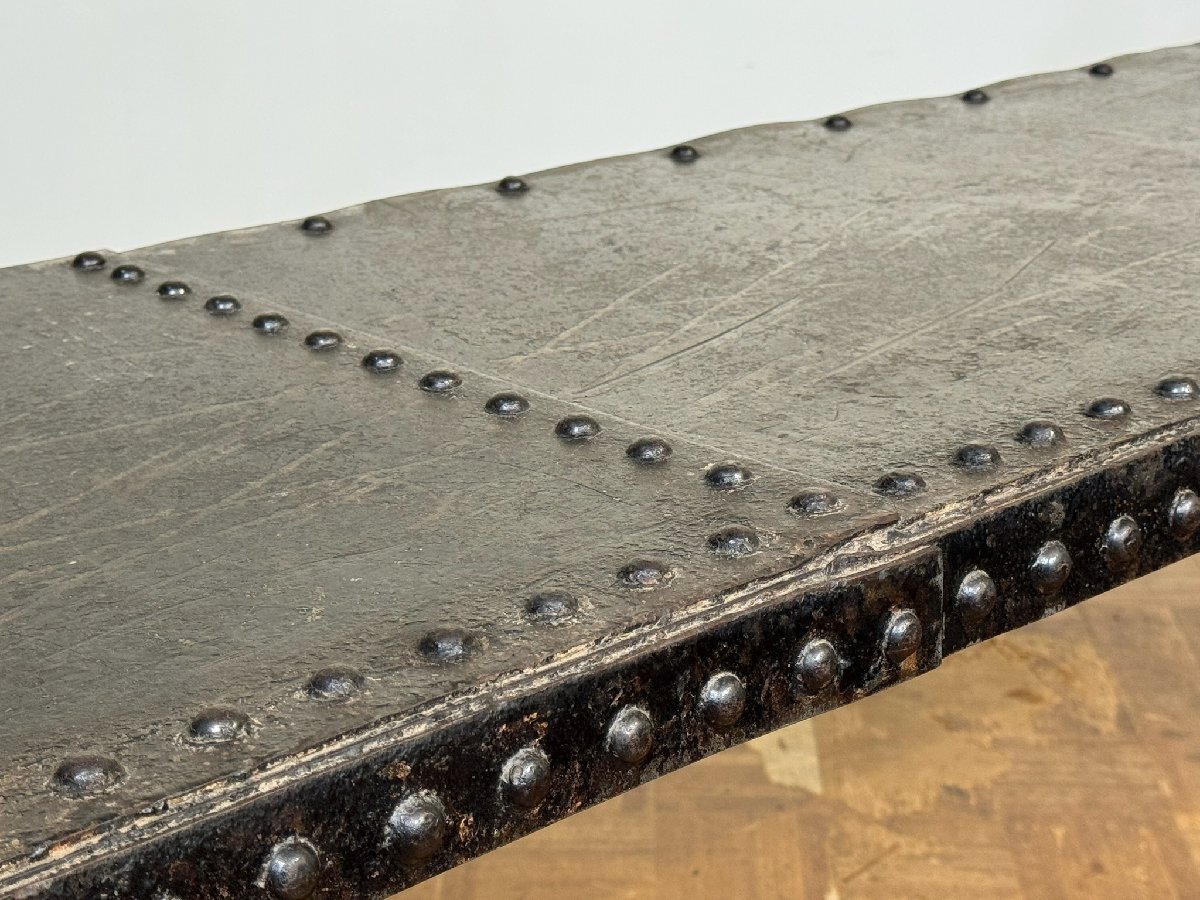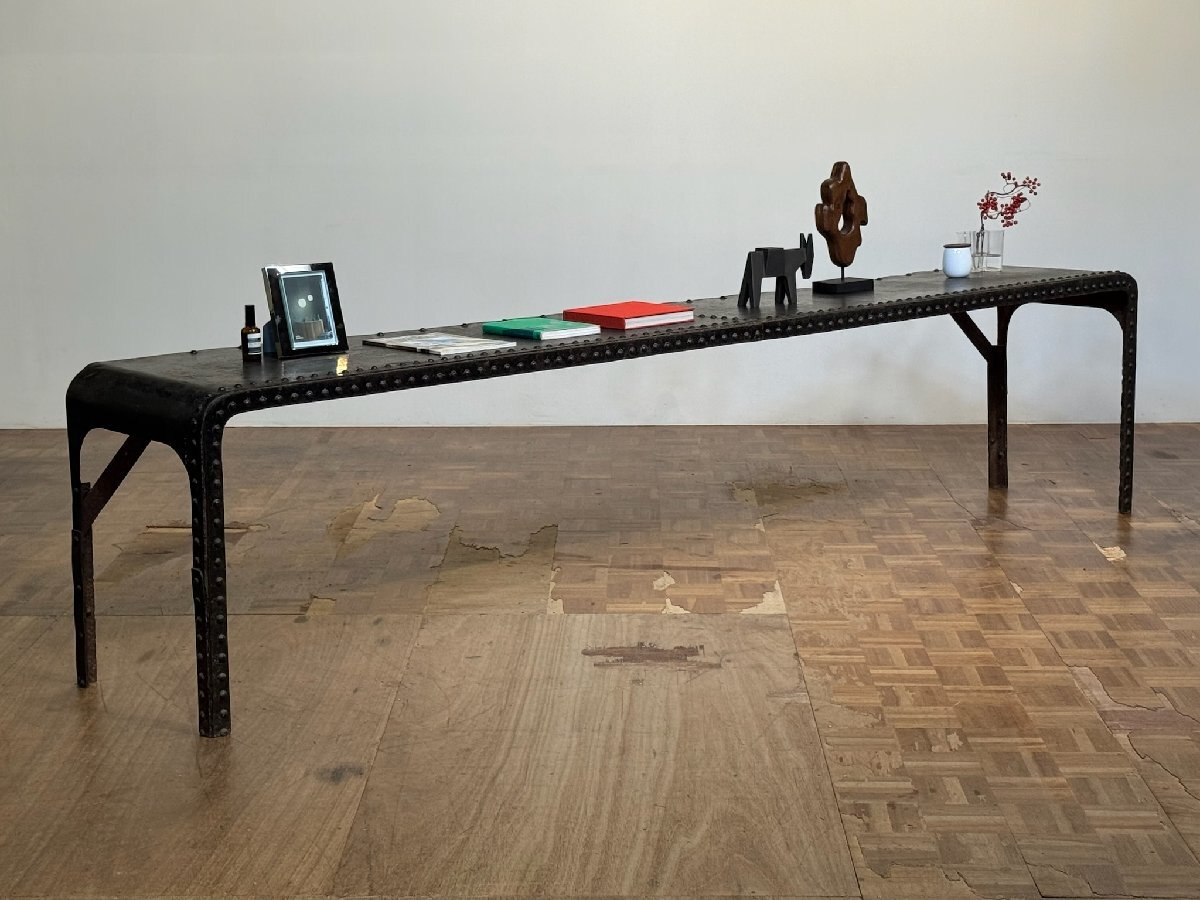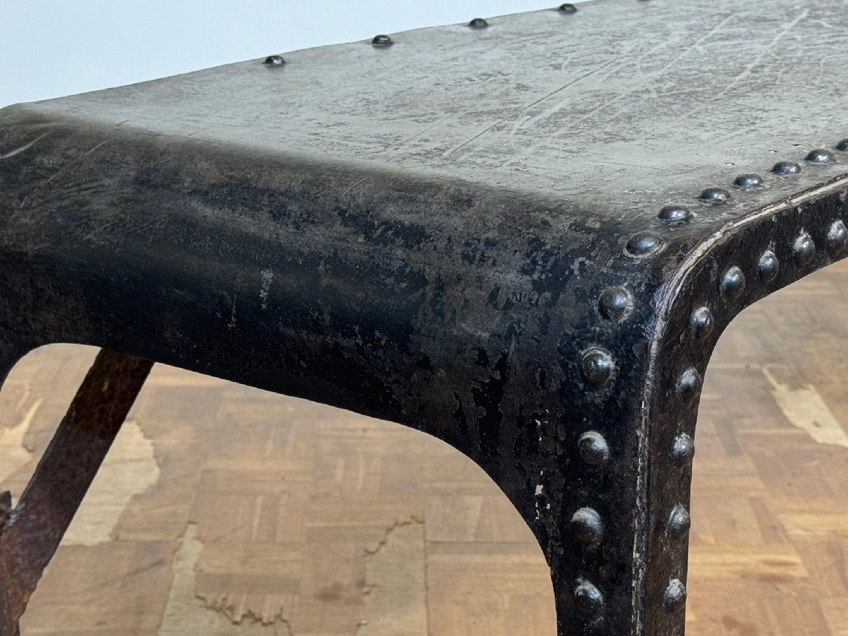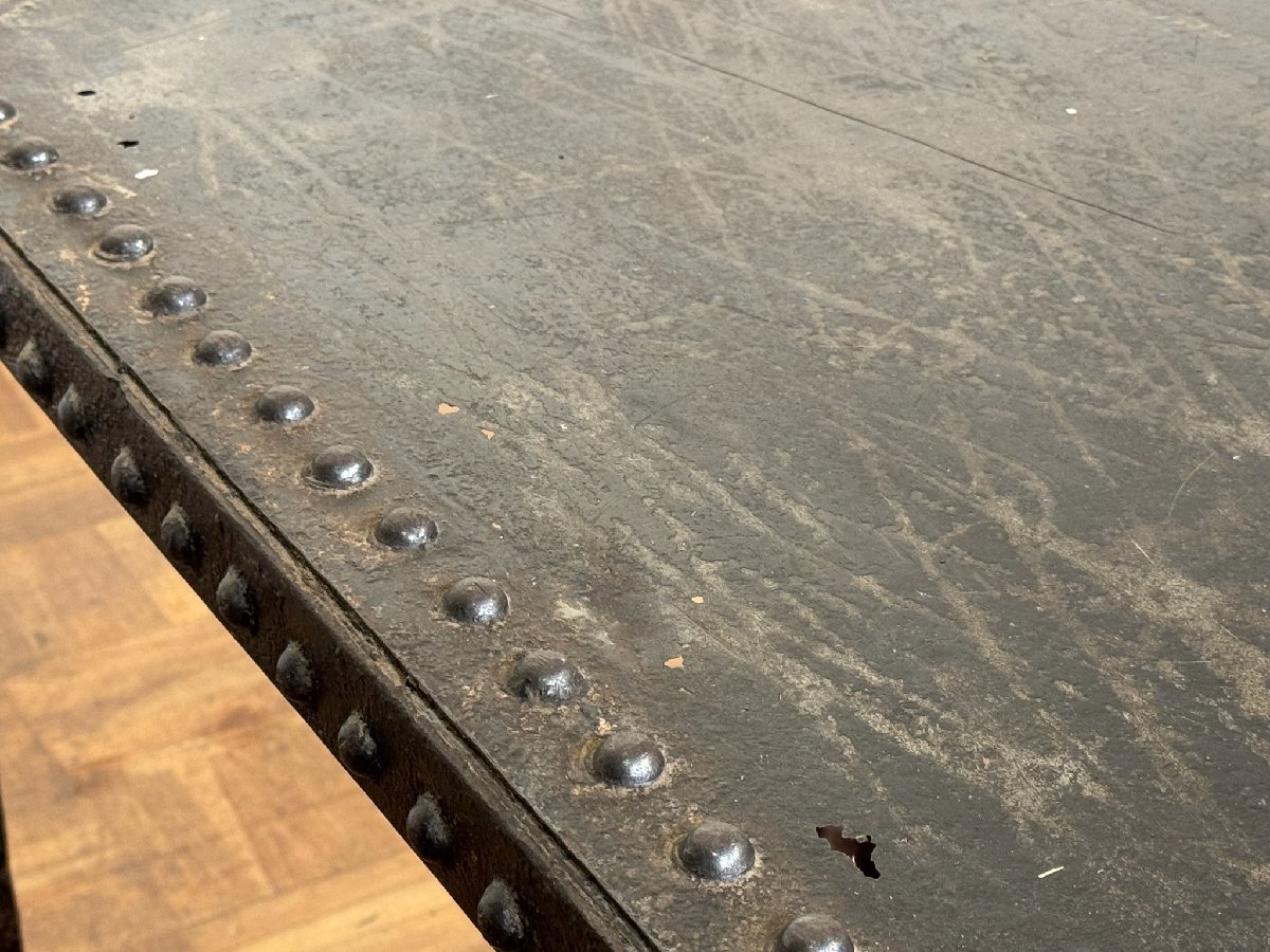 プロダクトを構成する全部位 / 全パーツを堅牢なスチール材で構成し、3000mmを超えるサイズをプロダクト両端のレッグスだけで支える超ストイックな構成を、強度を保持しつつデザインチャームとしても美しいリベット固定で飾り上げた、コンソールテーブルロングシェルフラック。1960~70sフランスヴィンテージ品。